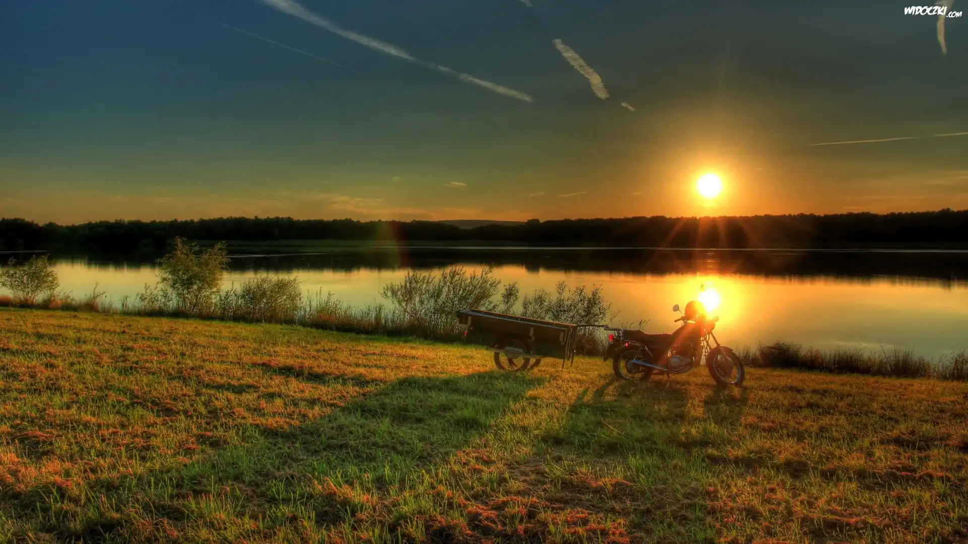 Zdjęcia, Rzeka, Zachód, Słońca, Motor, Przyczepka