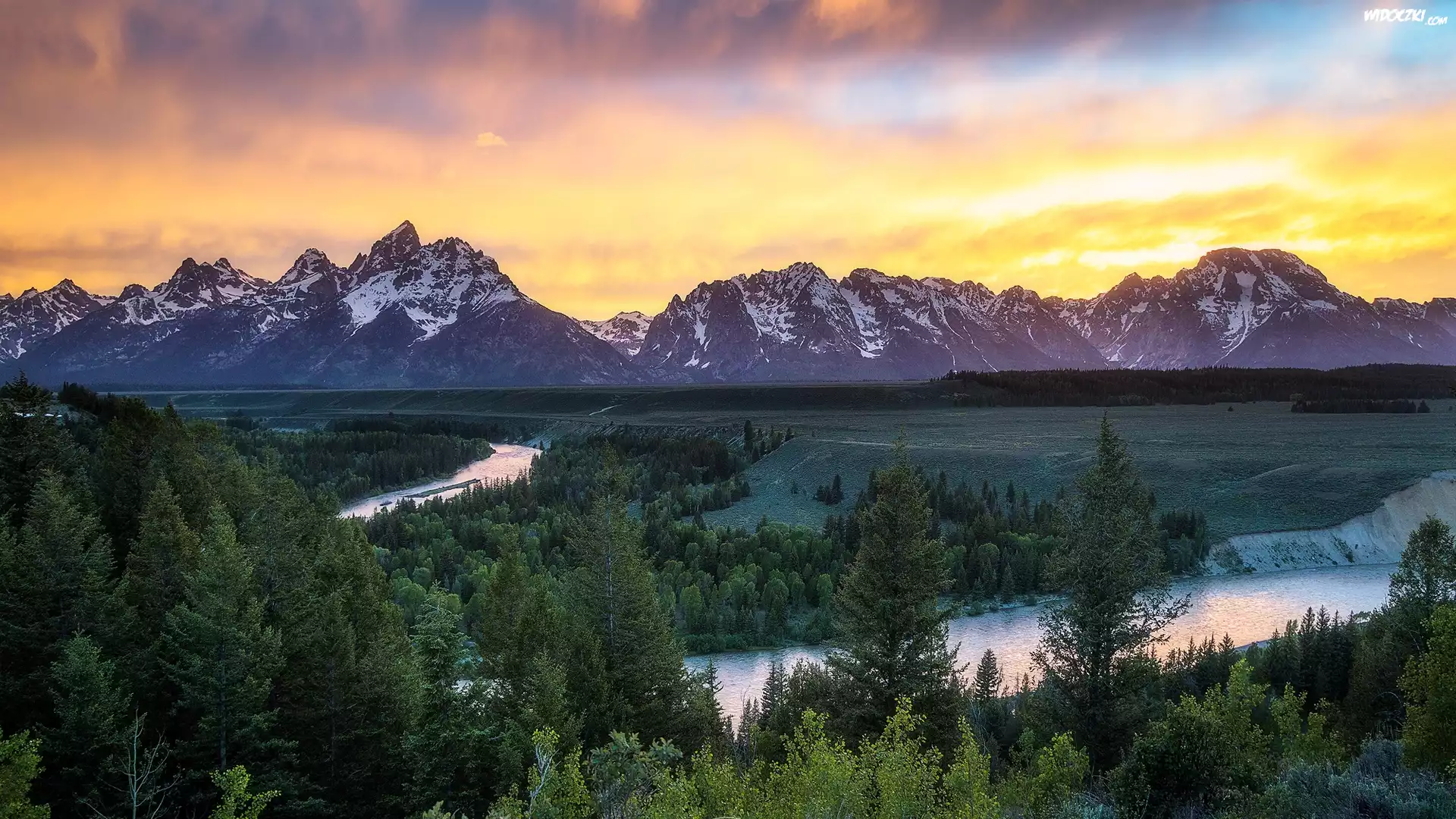 Stany Zjednoczone, Wyoming, Park Narodowy Grand Teton, Góry, Rzeka, Snake River, Zachód słońca, Drzewa |