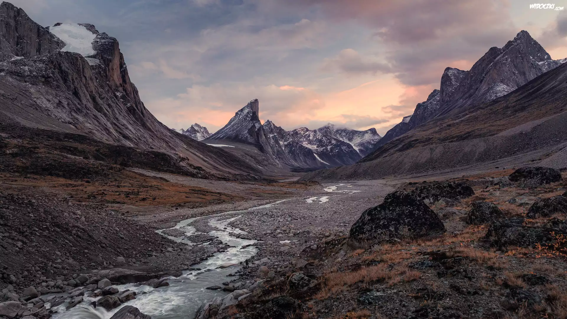 Zdjęcia, Góry, Skały, Rzeka, Park Narodowy Auyuittuq, Przełęcz, Akshayuk Pass, Nunavut, Kanada