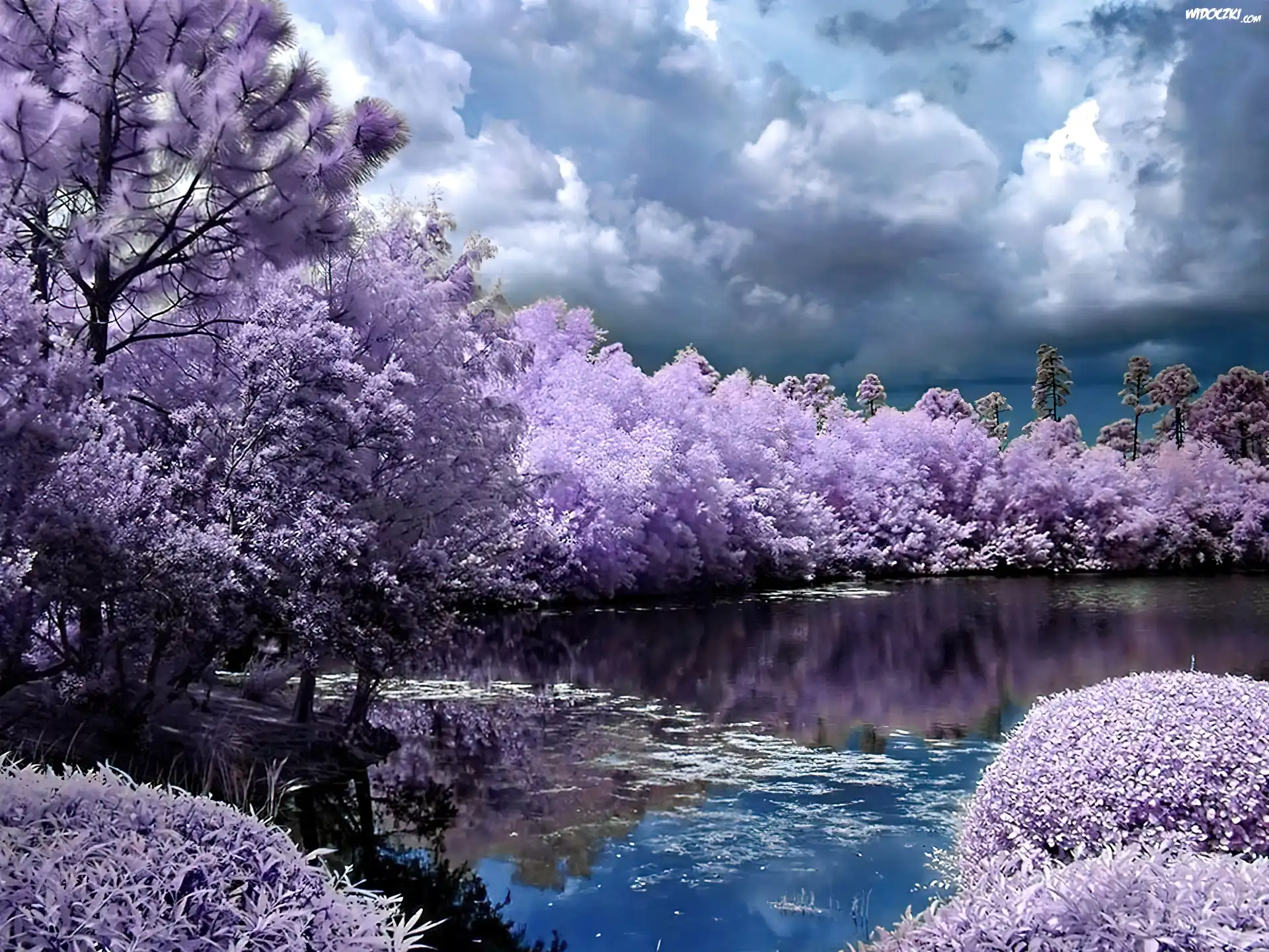 Zdjęcia, Rzeka, Kwitnące, Drzewa, Zachmurzone, Niebo, Odbicie