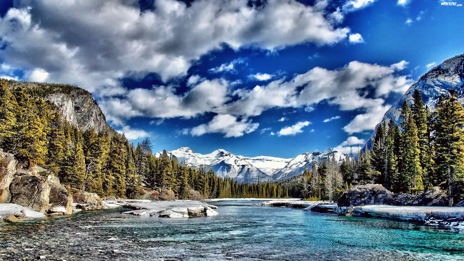 Zdjęcia, Rzeka, Lasy, Góry, Niebo, Obłoki
