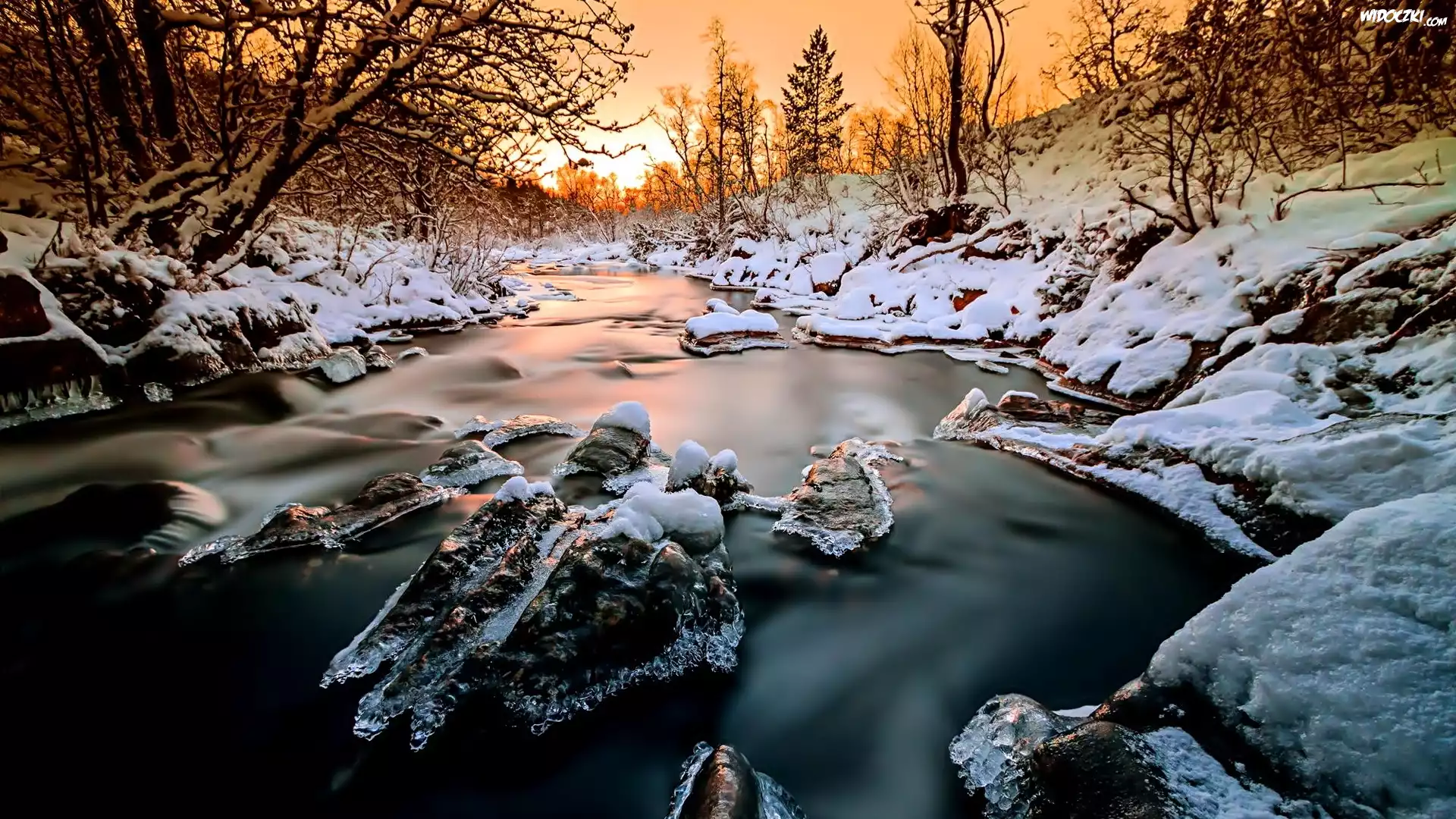 Zdjęcia, Rzeka, Zachód, Słońca, Śnieg, Drzewa