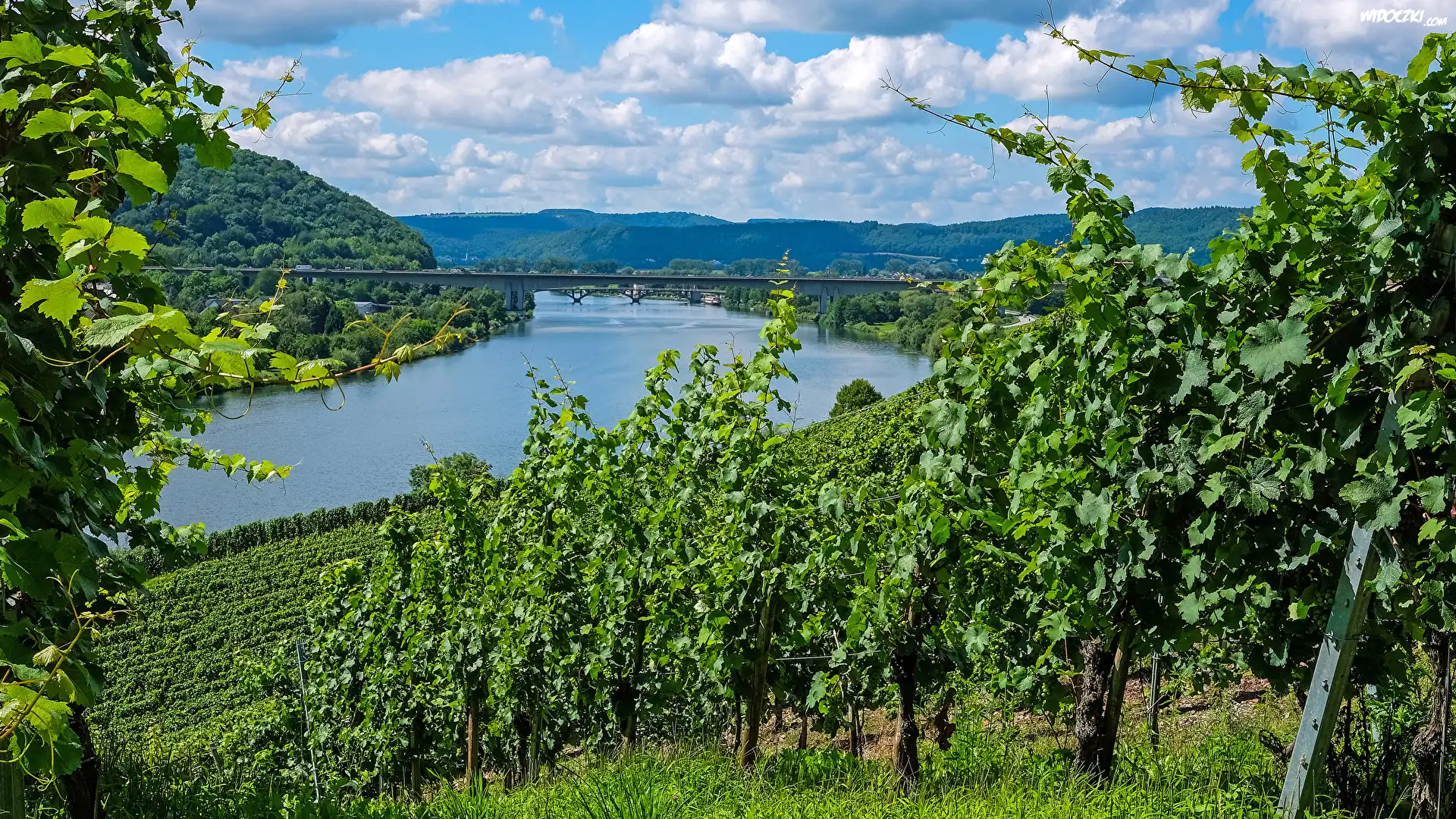 Zdjęcia, Niemcy, Rzeka Mozela, Most, Wzgórza, Winnice, Winorośla