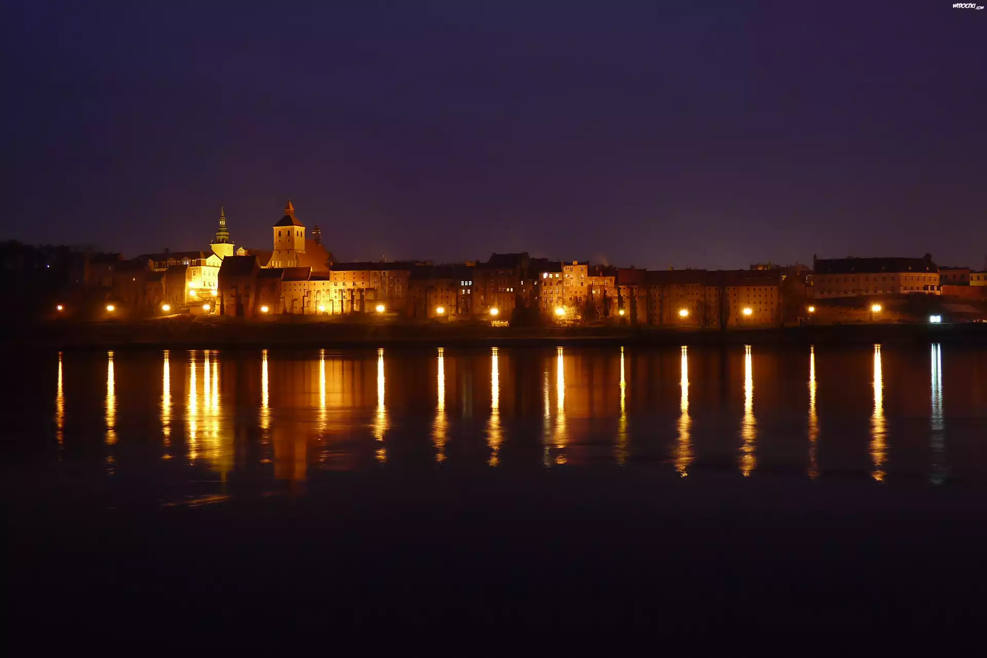 Rzeka, Miasto, GrudziÄ…dz, Odbicia, Noc