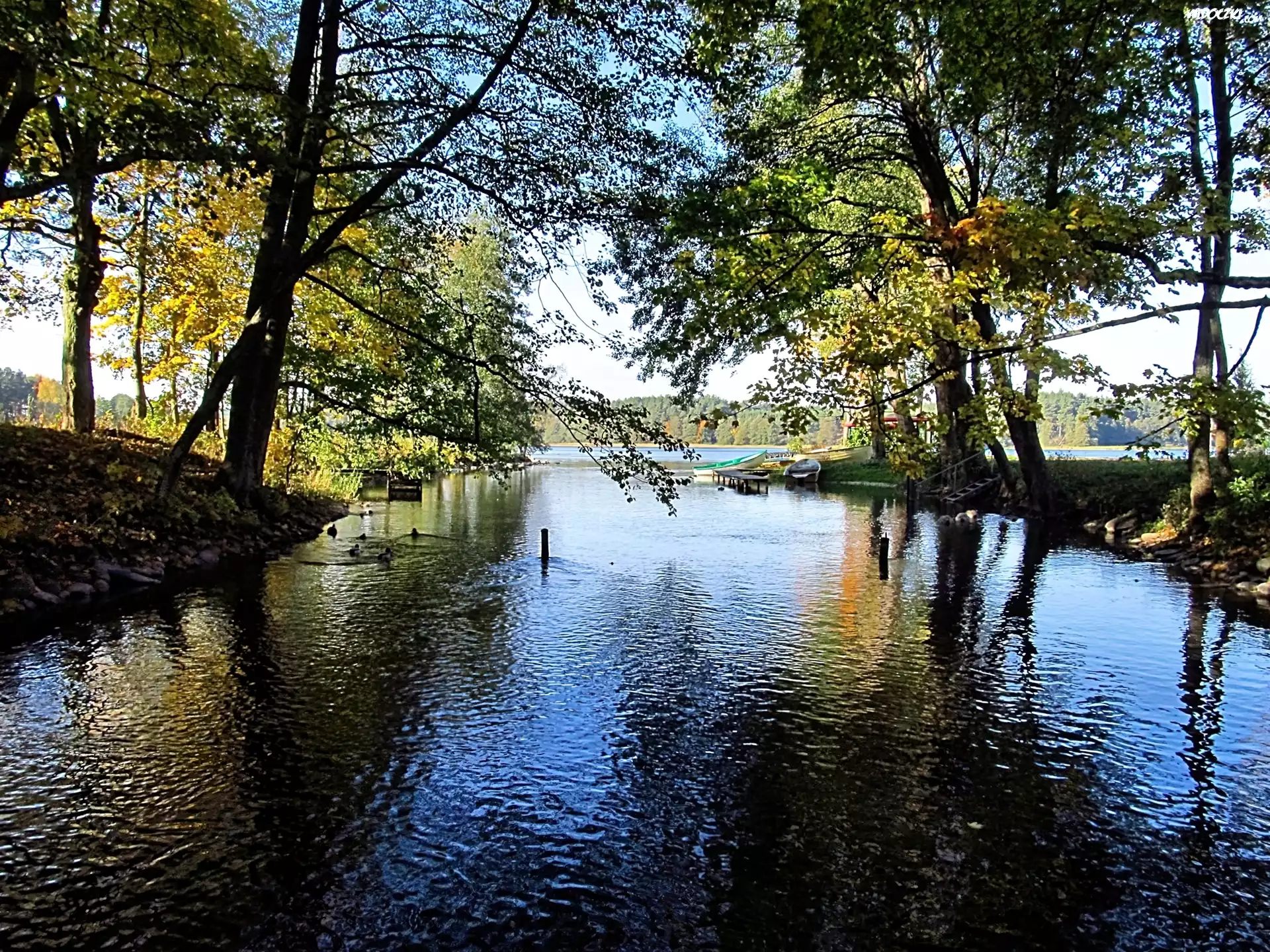 Rzeka, Drzewa, Łódki, Jesień