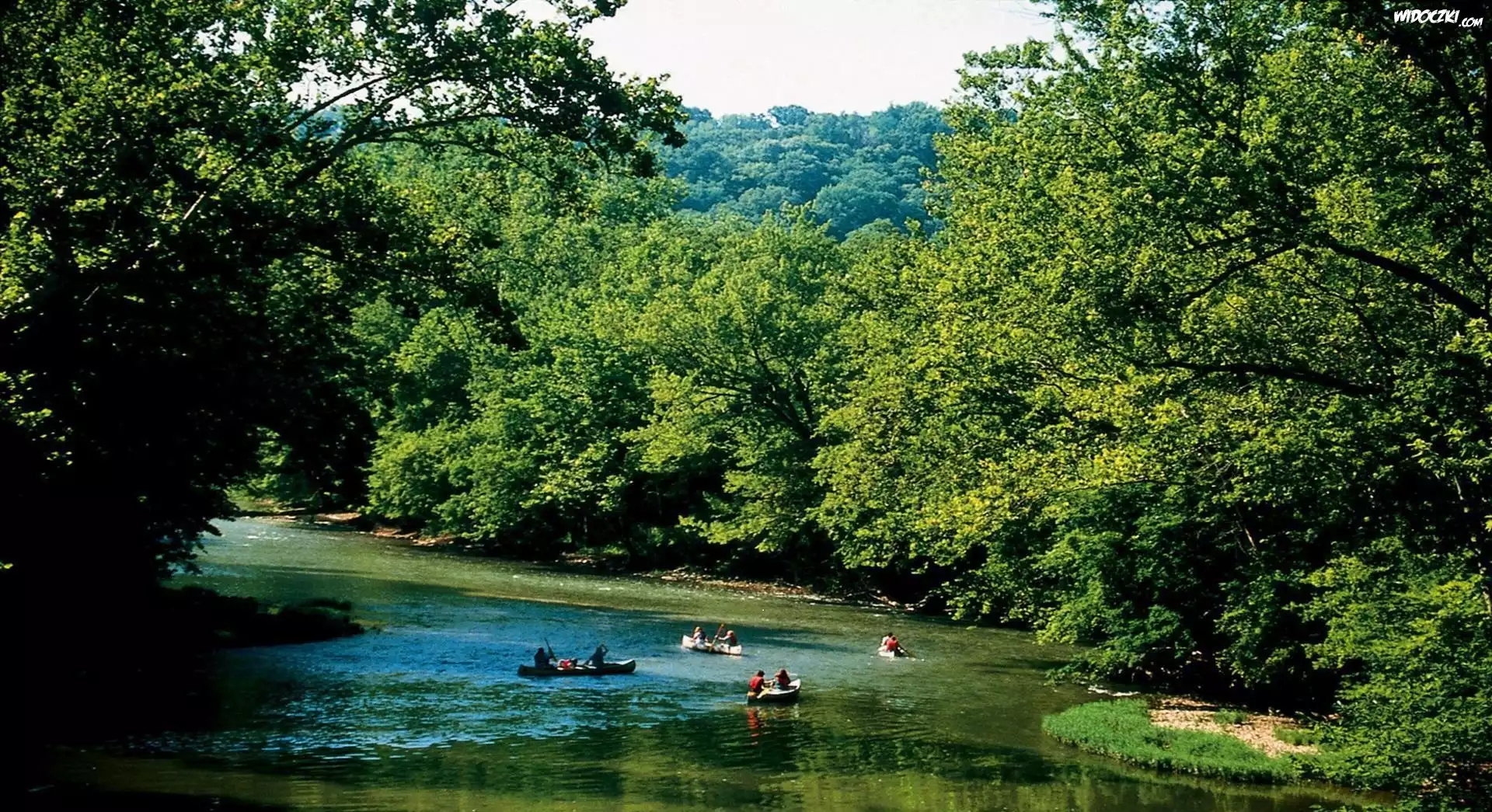 Rzeka, Drzewa, Łódki, Ludzie