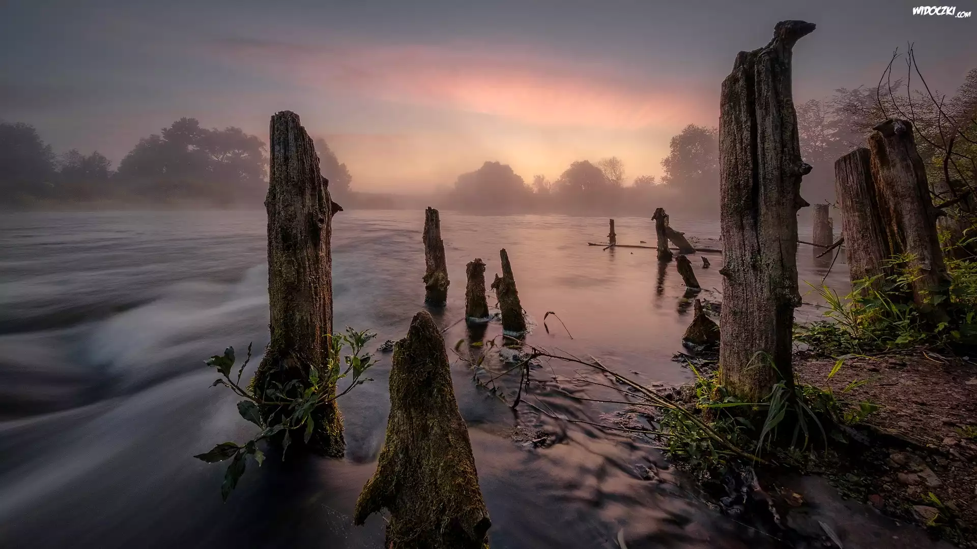 Rzeka, Wschód słońca, Mgła, Pale, Drzewa