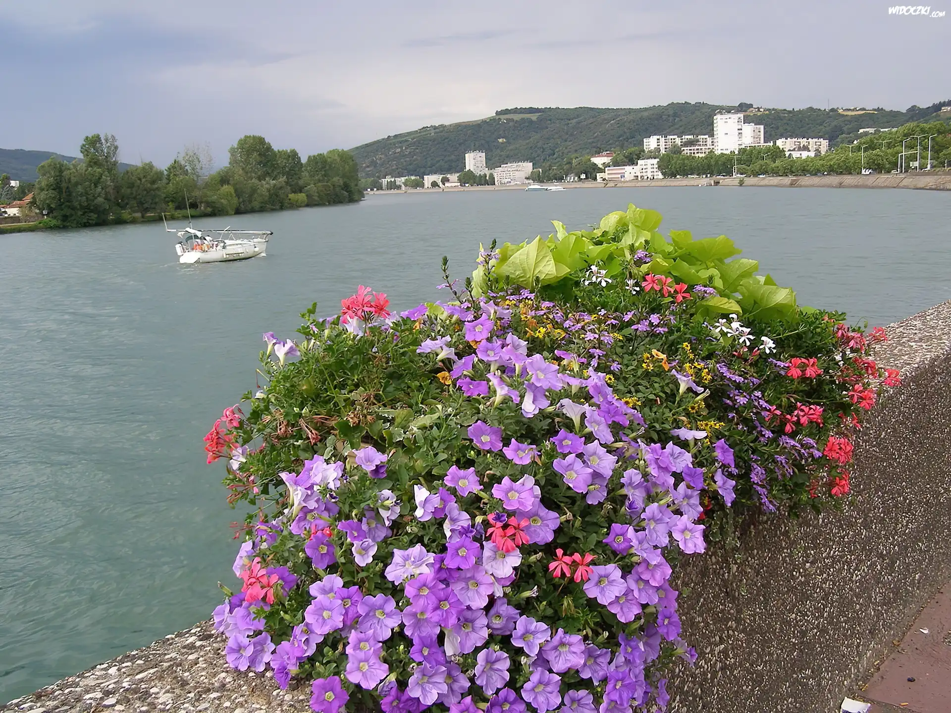 Rzeka, Vienne, Kwiaty, Panorama, Francja
