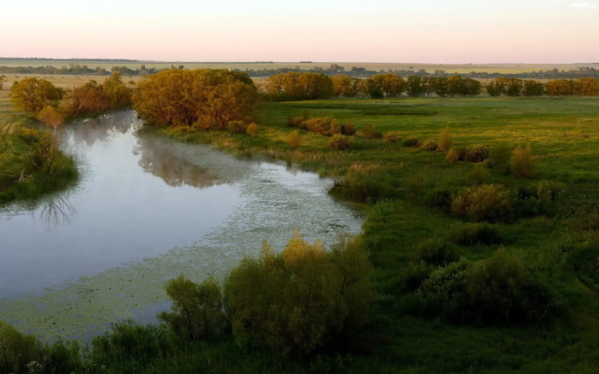 Rzeka, Łąki, Pola, Drzewa, Panorama, Jesień