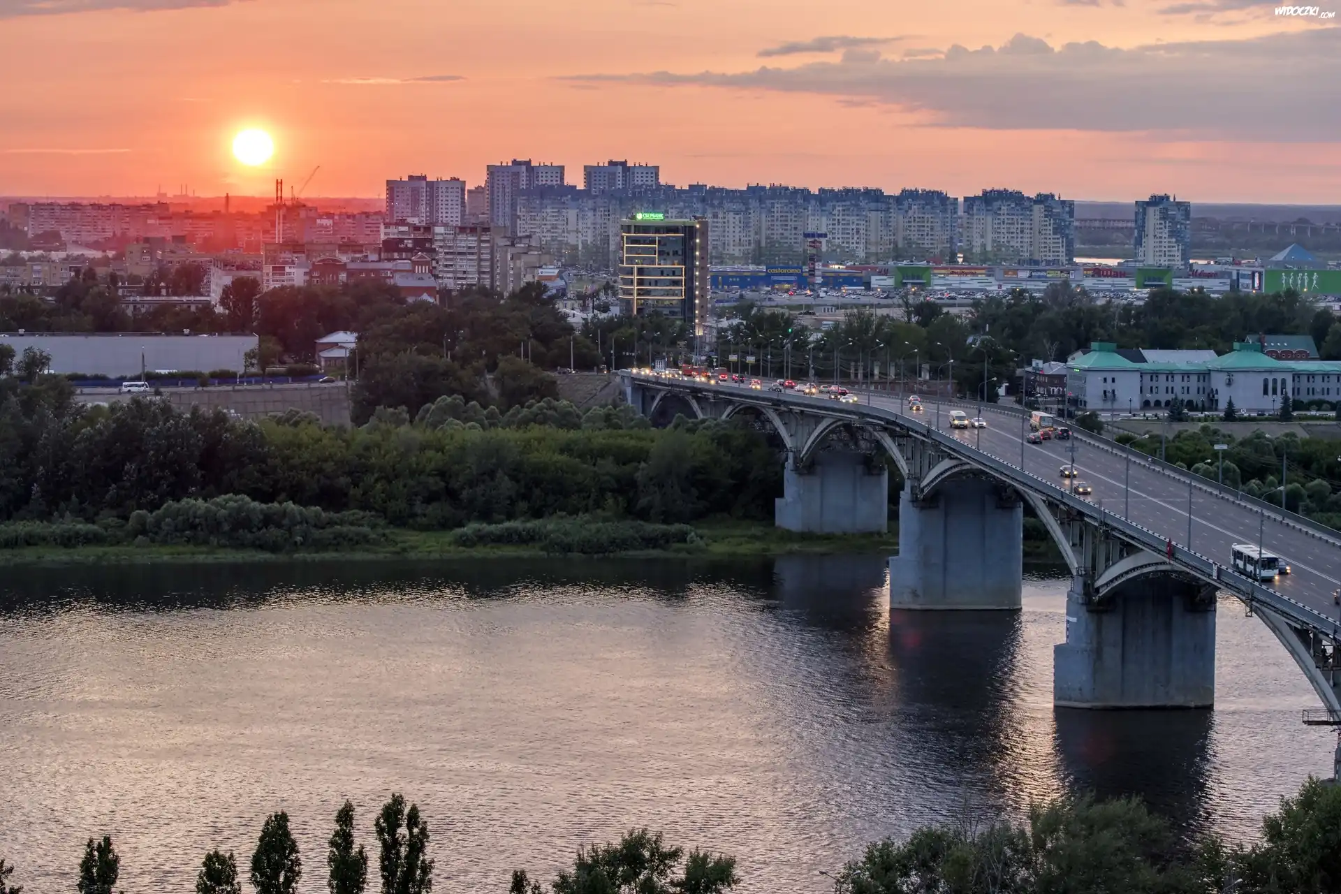 Zdjęcia, Rzeka, Most, Zachód, Słońca, Panorama, Miasta