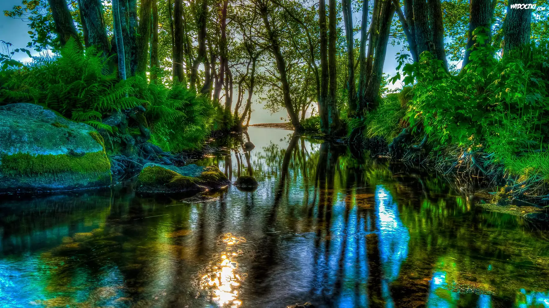 Zdjęcia, Rzeka, Kamienie, Paprocie, Drzewa