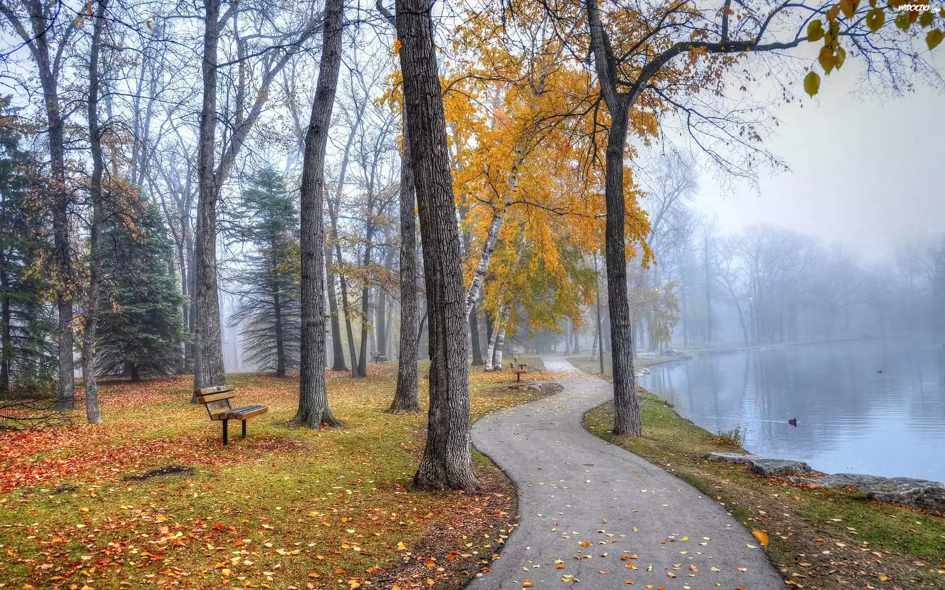 Zdjęcia, Park, Rzeka, Kaczki, Mgła, Ławki, Liście, Jesień