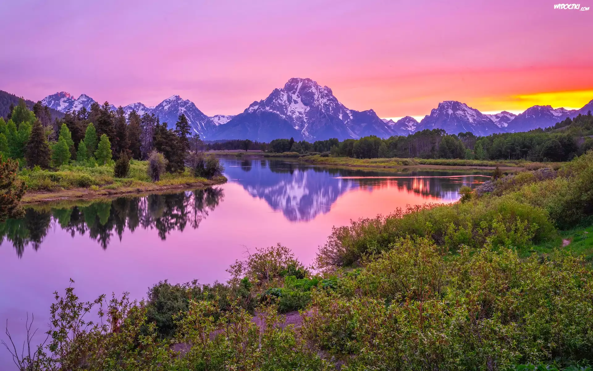 Stany Zjednoczone, Wyoming, Góra, Mount Sneffels, Rzeka, Snake River, Park Narodowy Grand Teton, Drzewa, Zachód słońca |