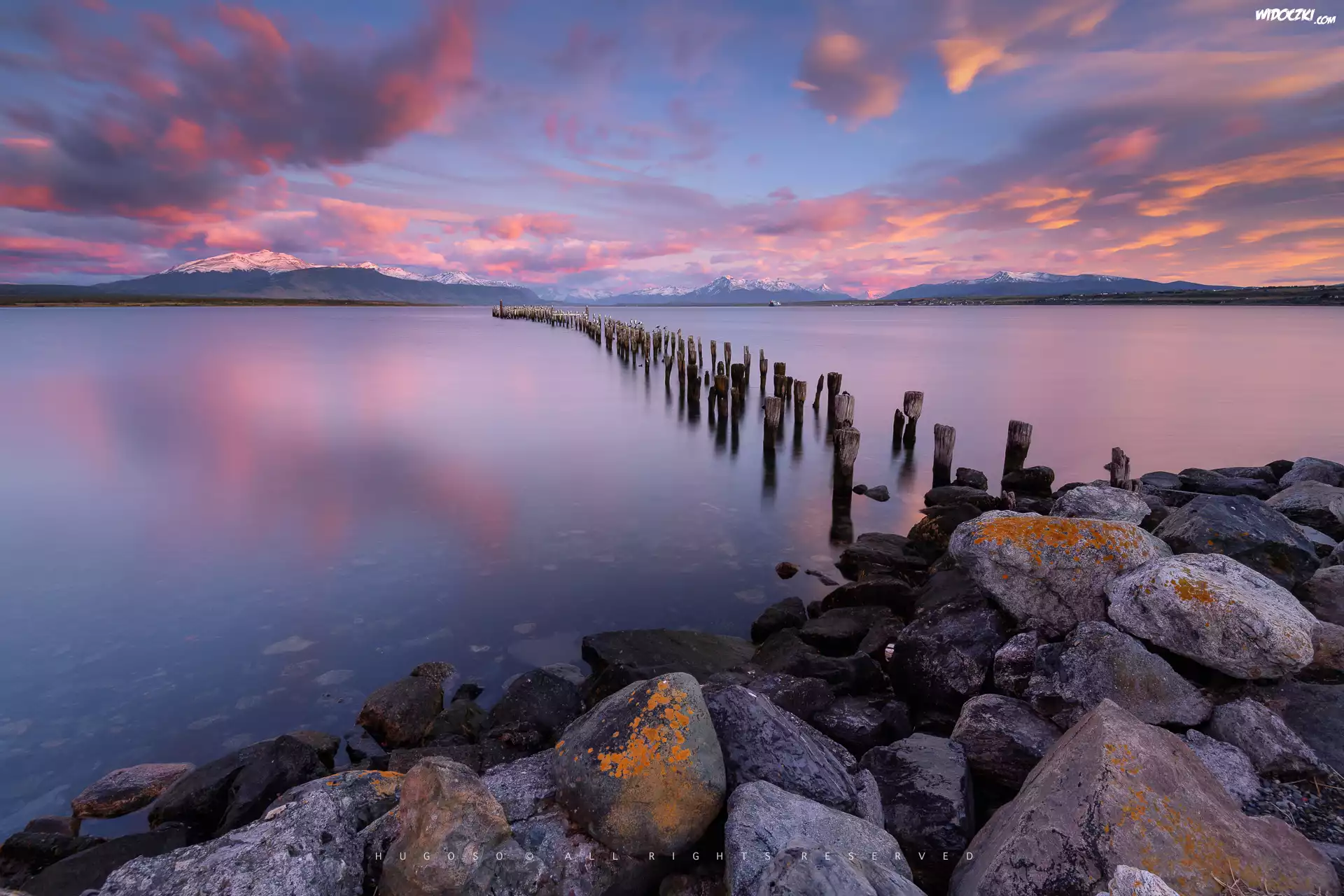 Zdjęcia, Rzeka, Niebo, Kamienie, Kołki, Zachód słońca, Puerto Natales, Patagonia, Chile