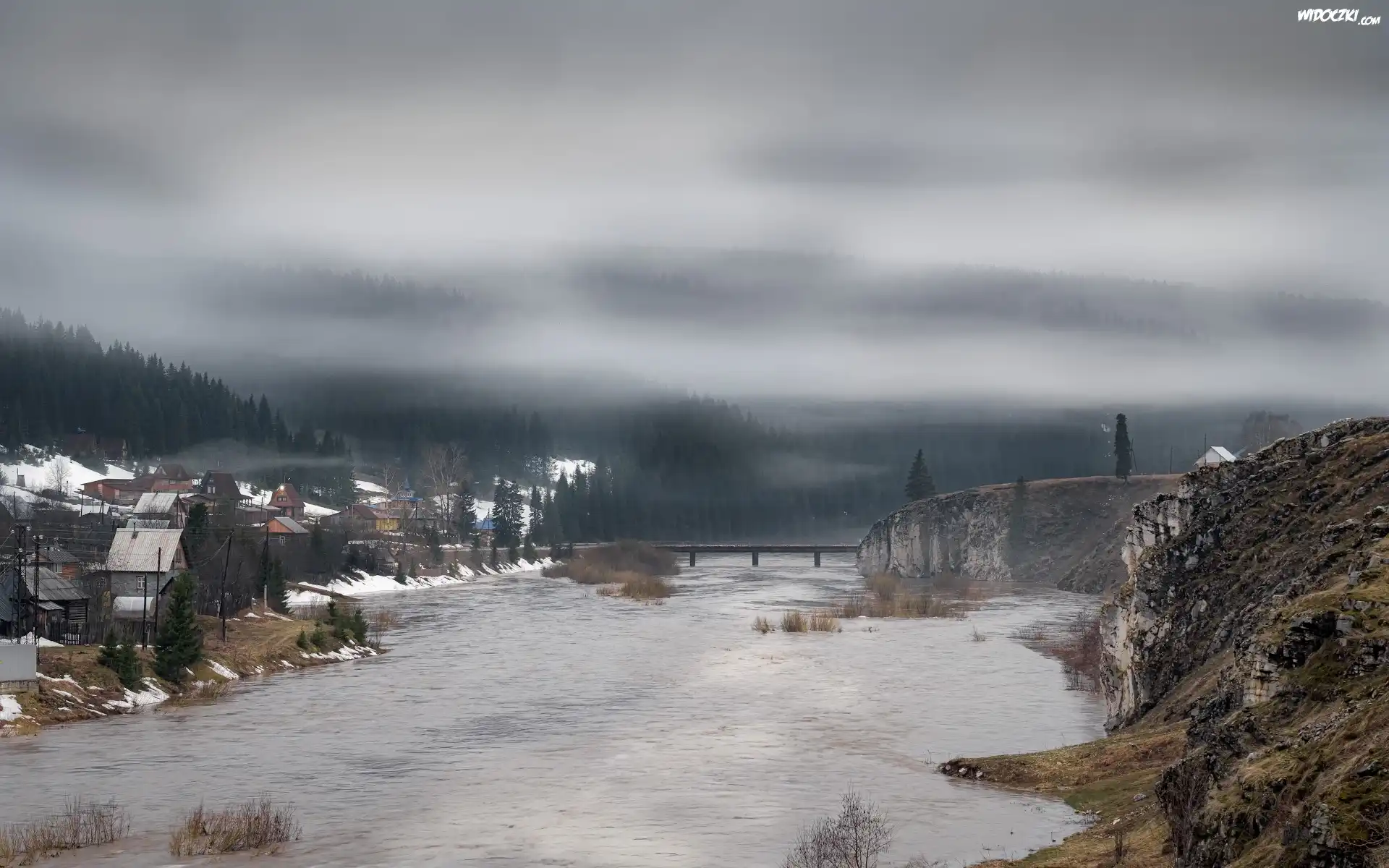 Rzeka Koyva, Wieś Kuse-Aleksandrovsky, Most, Mgła, Skarpa, Domy, Świerki, Śnieg, Gornozawodsk, Kraj Permski, Rosja |