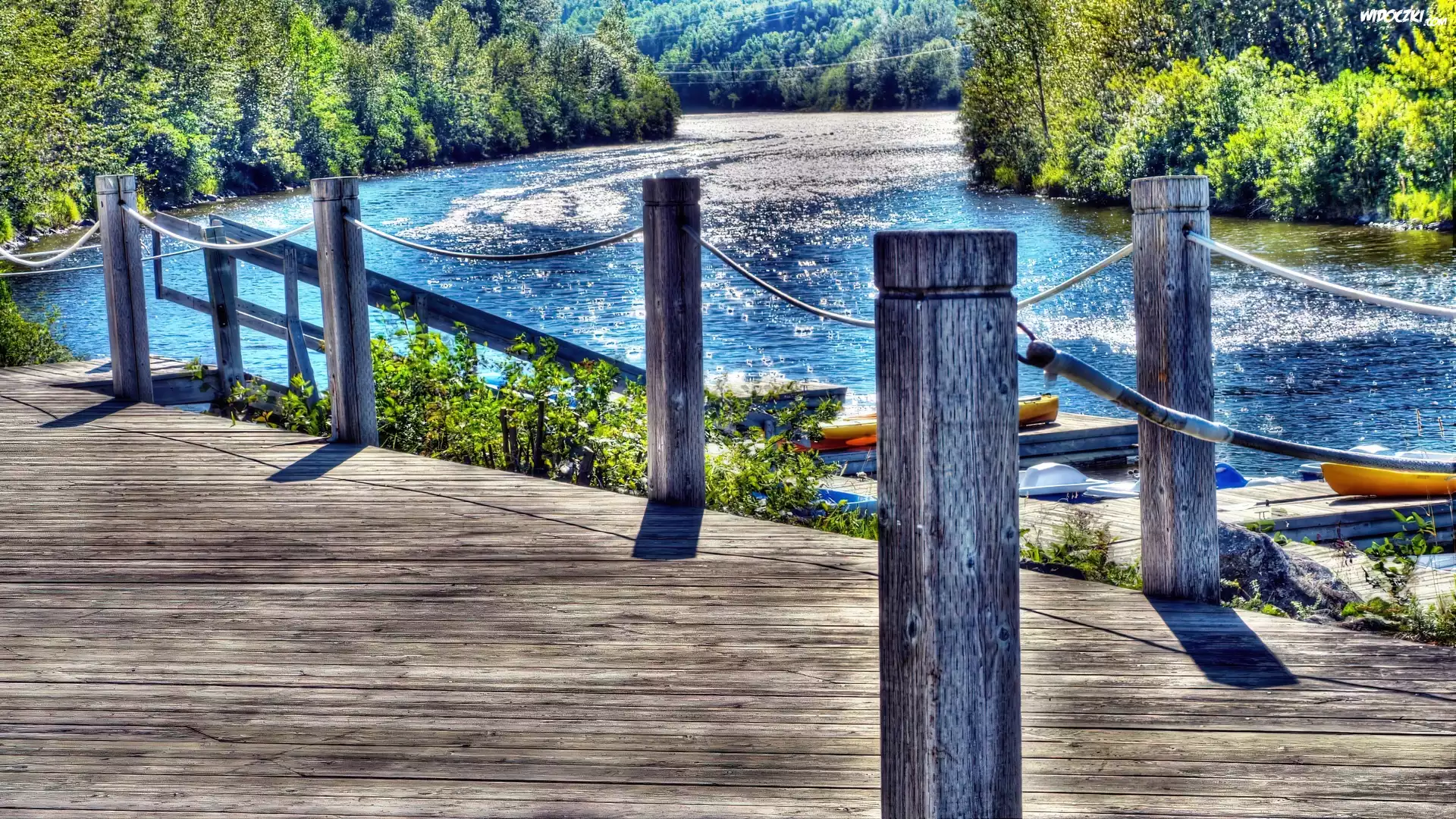 Zdjęcia, Rzeka, Las, Pomost, Łódki