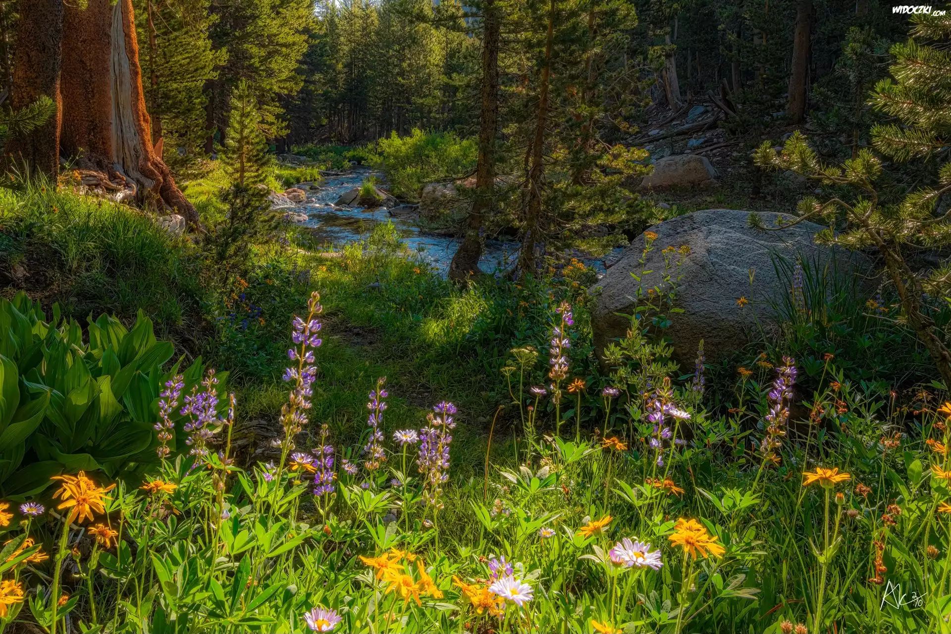 Zdjęcia, Las, Drzewa, Potok, Rzeka, Kamienie, Kwiaty, Roślinność