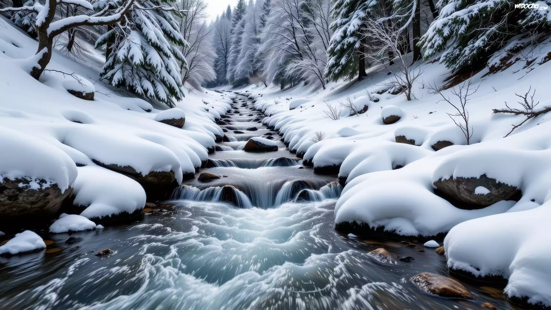Zdjęcia, Zima, Rwący, Potok, Rzeka, Ośnieżona, Skarpa, Drzewa