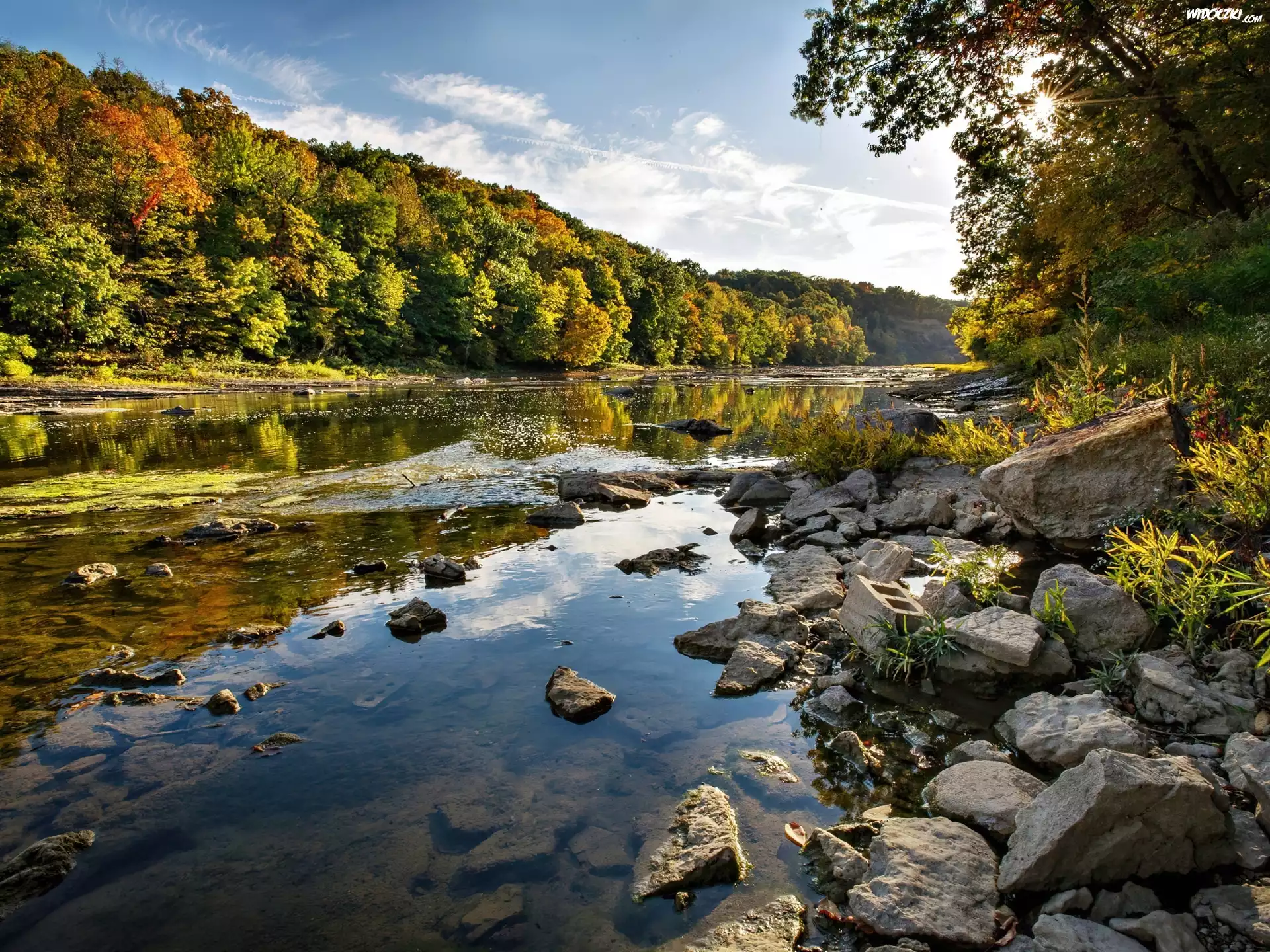 Rzeka, Kamienie, Las, Promienie, Słońca