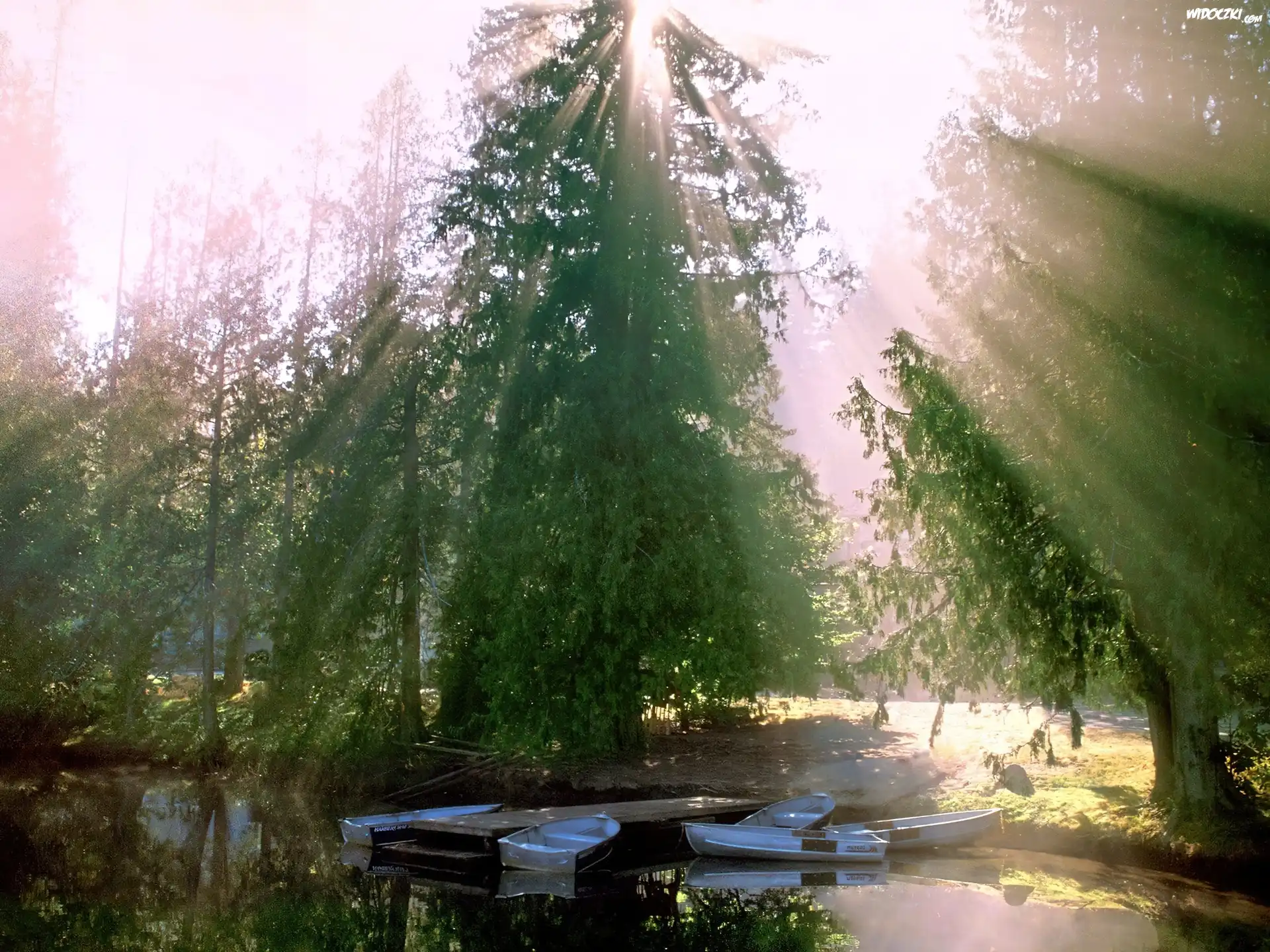 Rzeka, Drzewa, Łódki, Promienie, Słońca