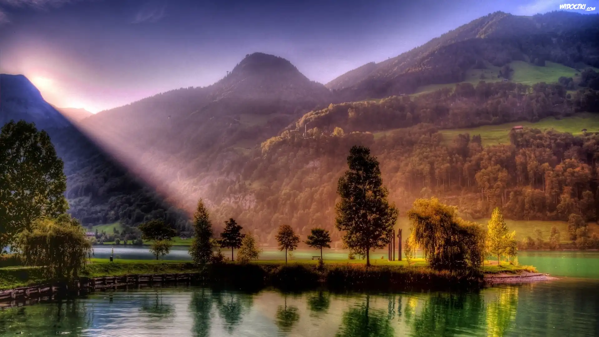 Zdjęcia, Rzeka, Drzewa, Góry, Przebijające, Słońce