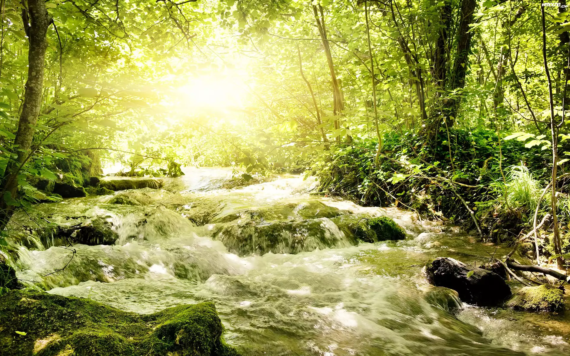 Zdjęcia, Rzeka, Kamienie, Las, Przebijające, Światło