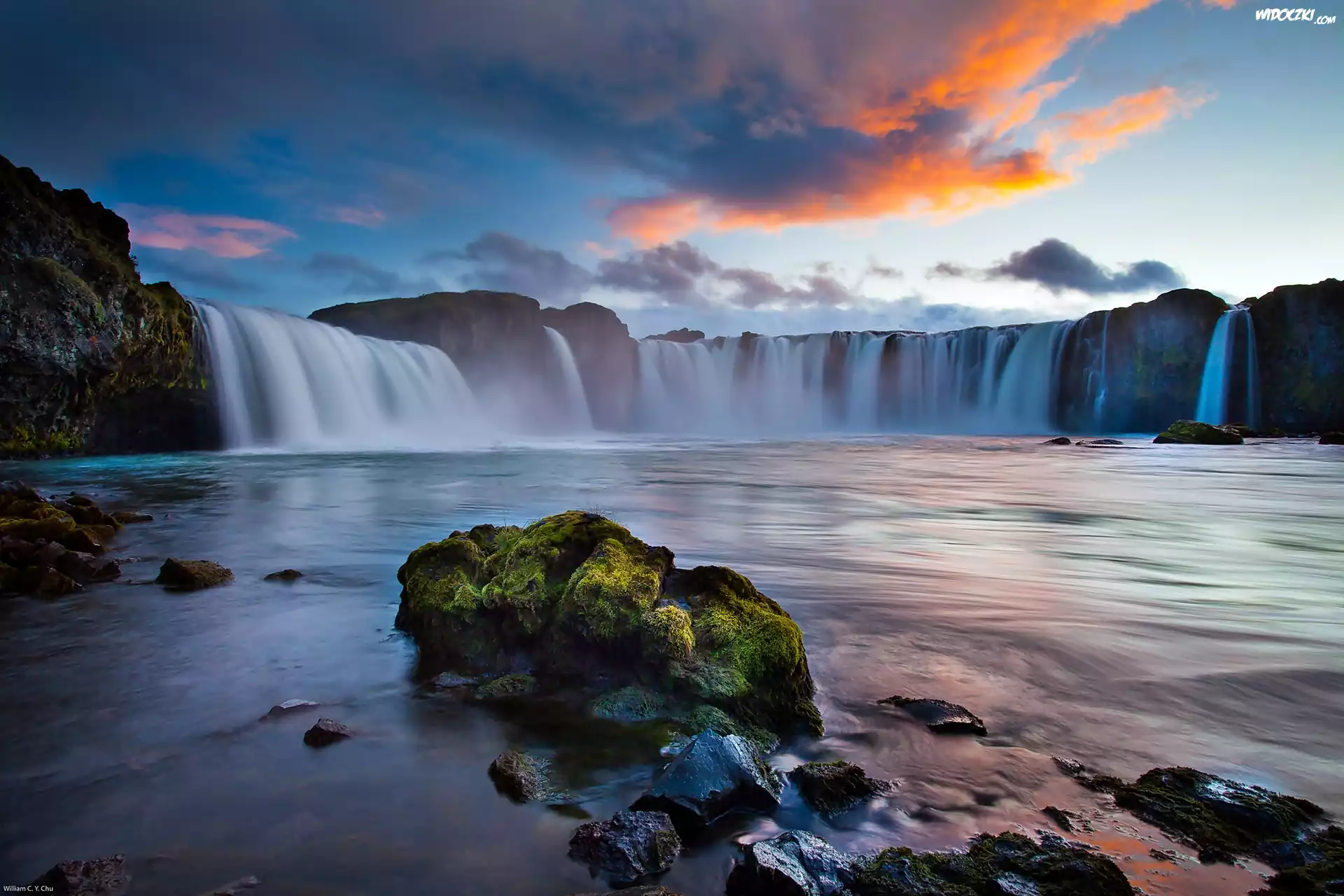 Zdjęcia, Rzeka, Skały, Wodospad, Chmury, Przebijające, Światło