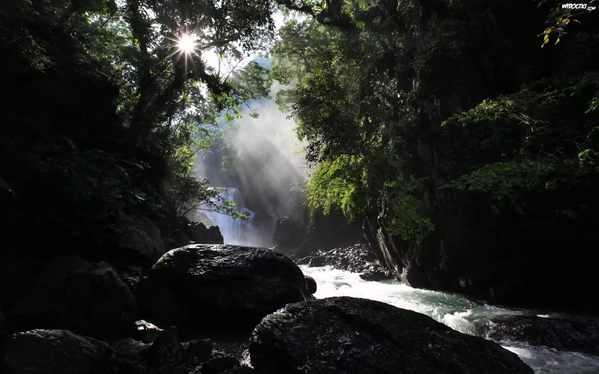 Rzeka, Kamienie, Drzewa, Prześwitujące, Słońce