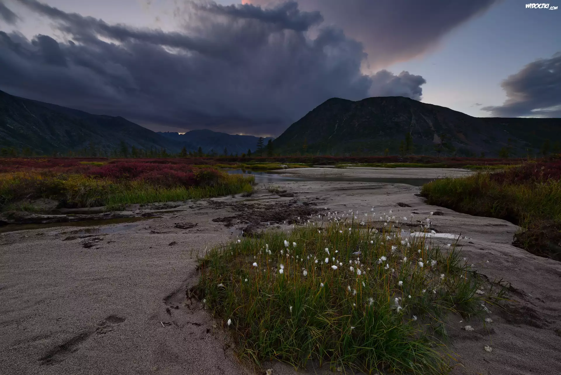 Zdjęcia, Góry, Rzeka, Potok Studienyj, Drzewa, Chmury, Kołyma, Rosja