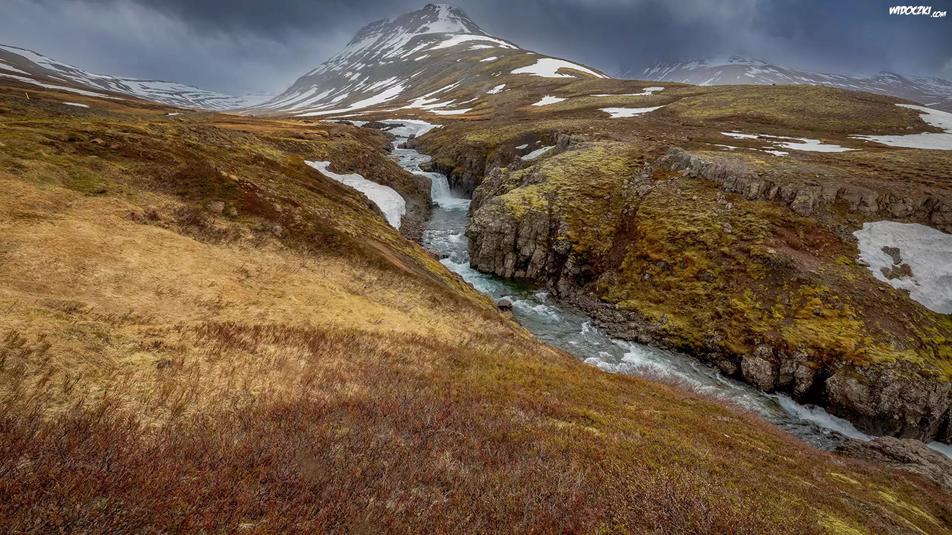 Zdjęcia, Wzgórza, Ośnieżona, Góra, Rzeka, Potok, Roślinność