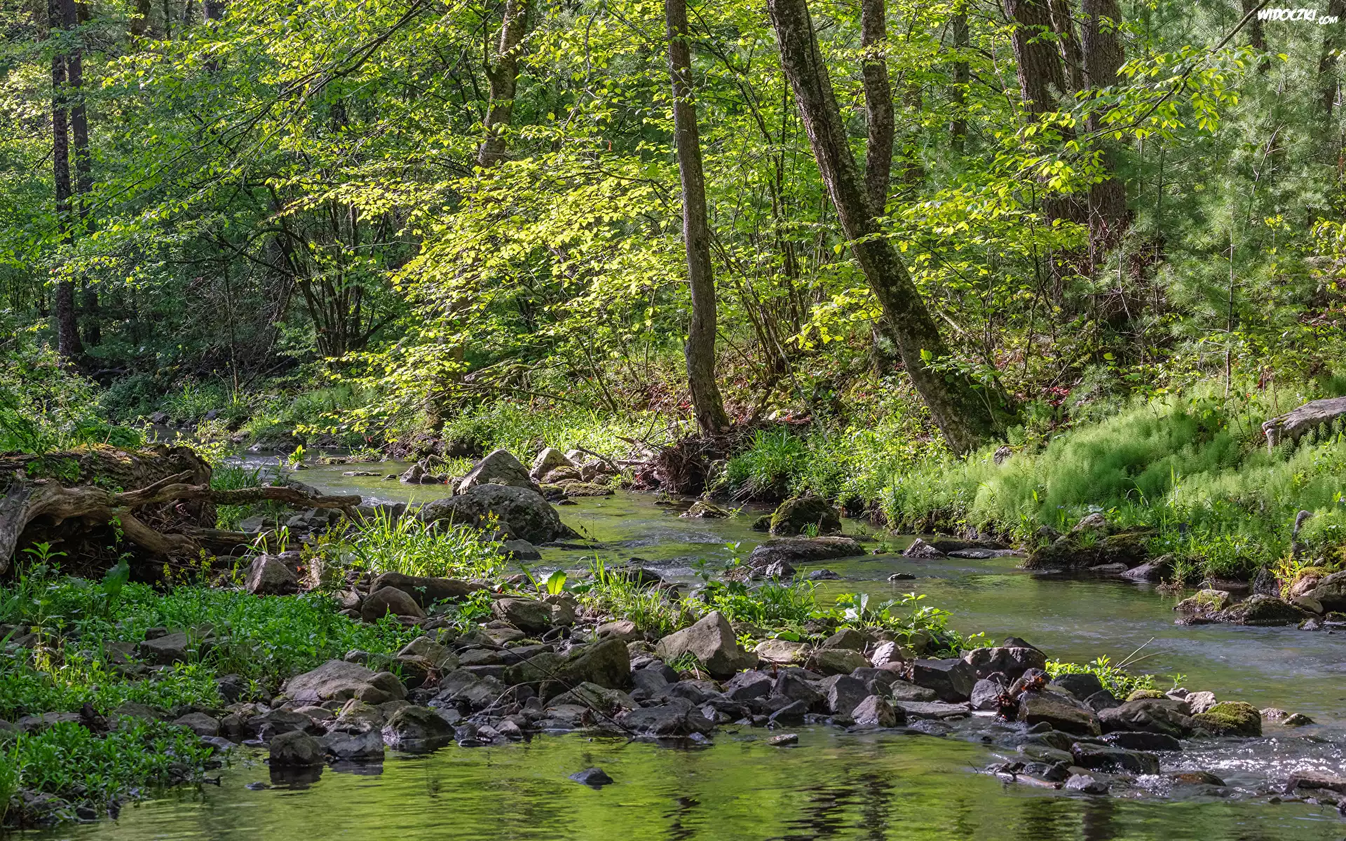 Zdjęcia, Las, Drzewa, Potok, Rzeka, Kamienie, Roślinność