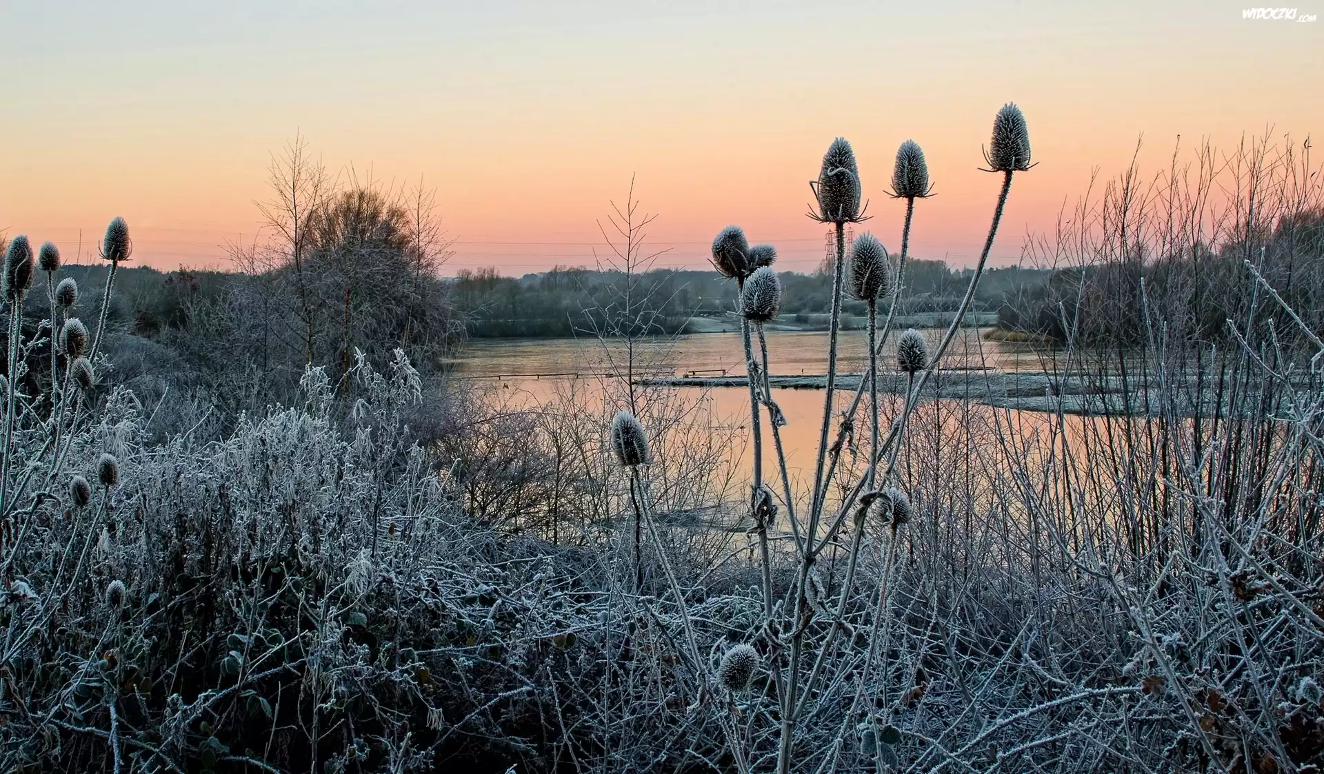 Zdjęcia, Rzeka, Wschód, Słońca, Rośliny, Rzepy