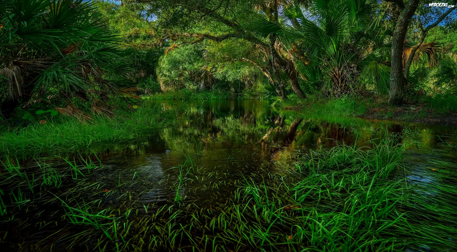 Rzeka Myakka River, Park stanowy Myakka River, Stan Floryda, Stany Zjednoczone, Drzewa, Las, Rośliny, Trawa |
