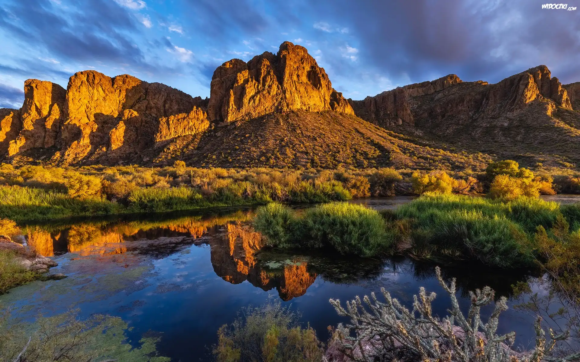Zdjęcia, Stany Zjednoczone, Arizona, Góry, Goldfield Mountains, Rzeka, Salt River, Roślinność, Chmury