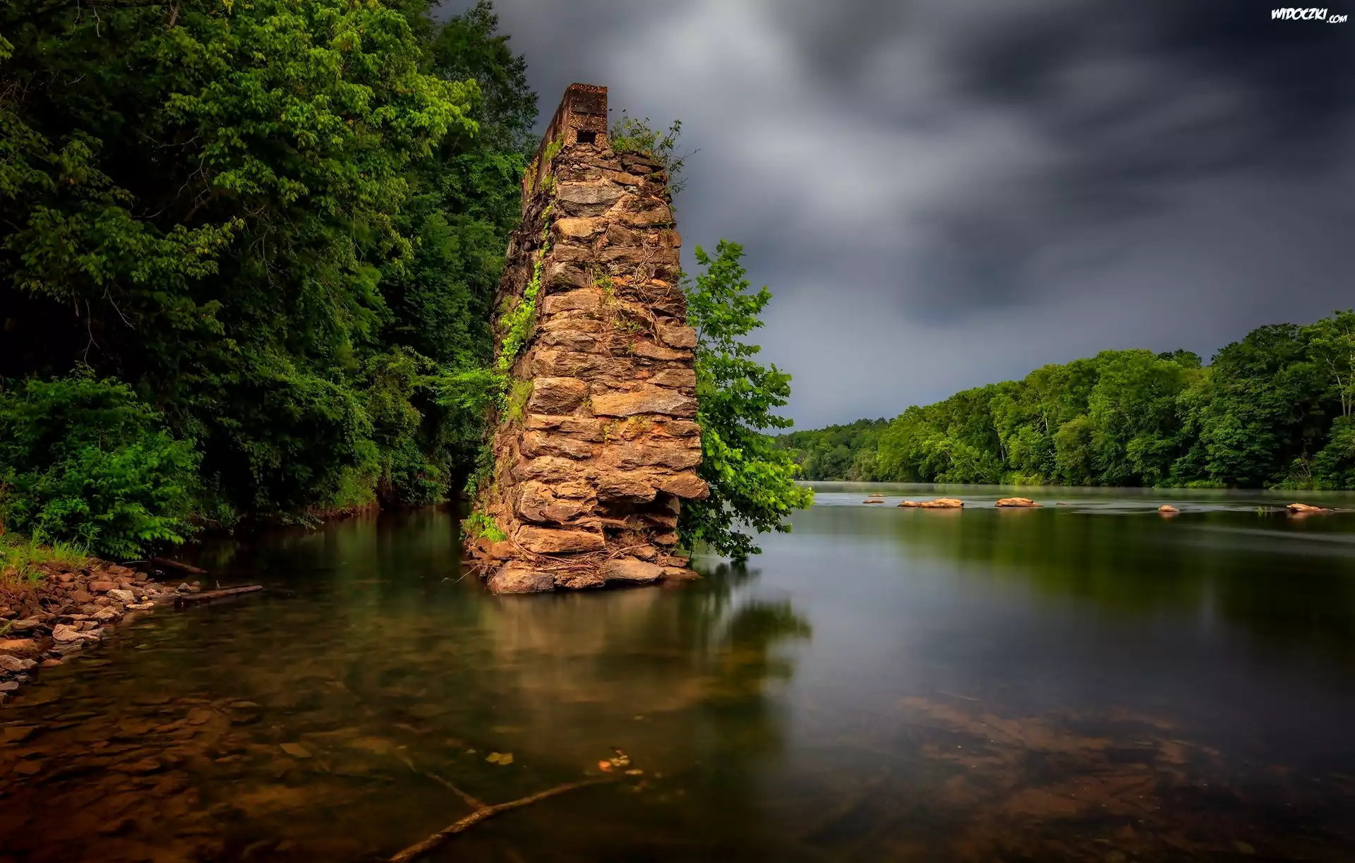 Zdjęcia, Rzeka, Drzewa, Skała, Kamienie