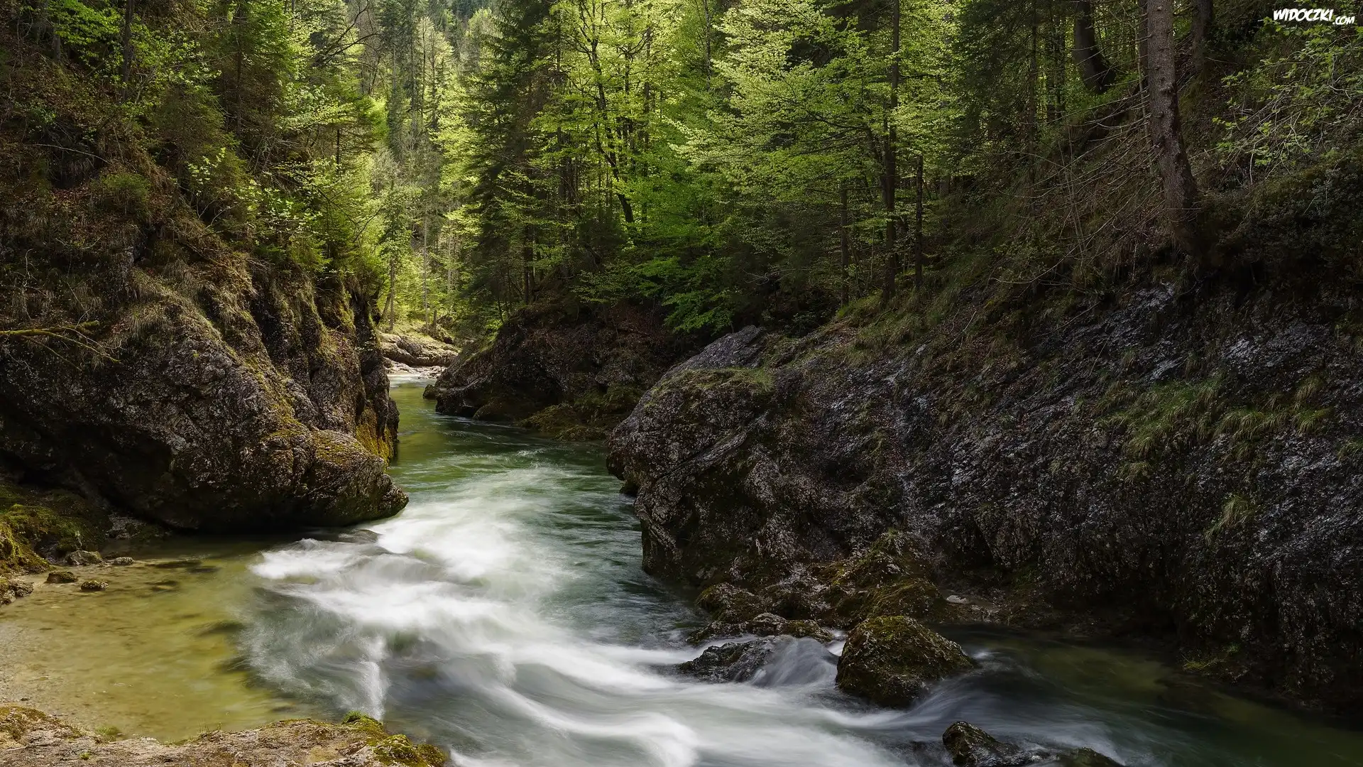 Zdjęcia, Las, Rzeka, Skały, Zielone, Drzewa