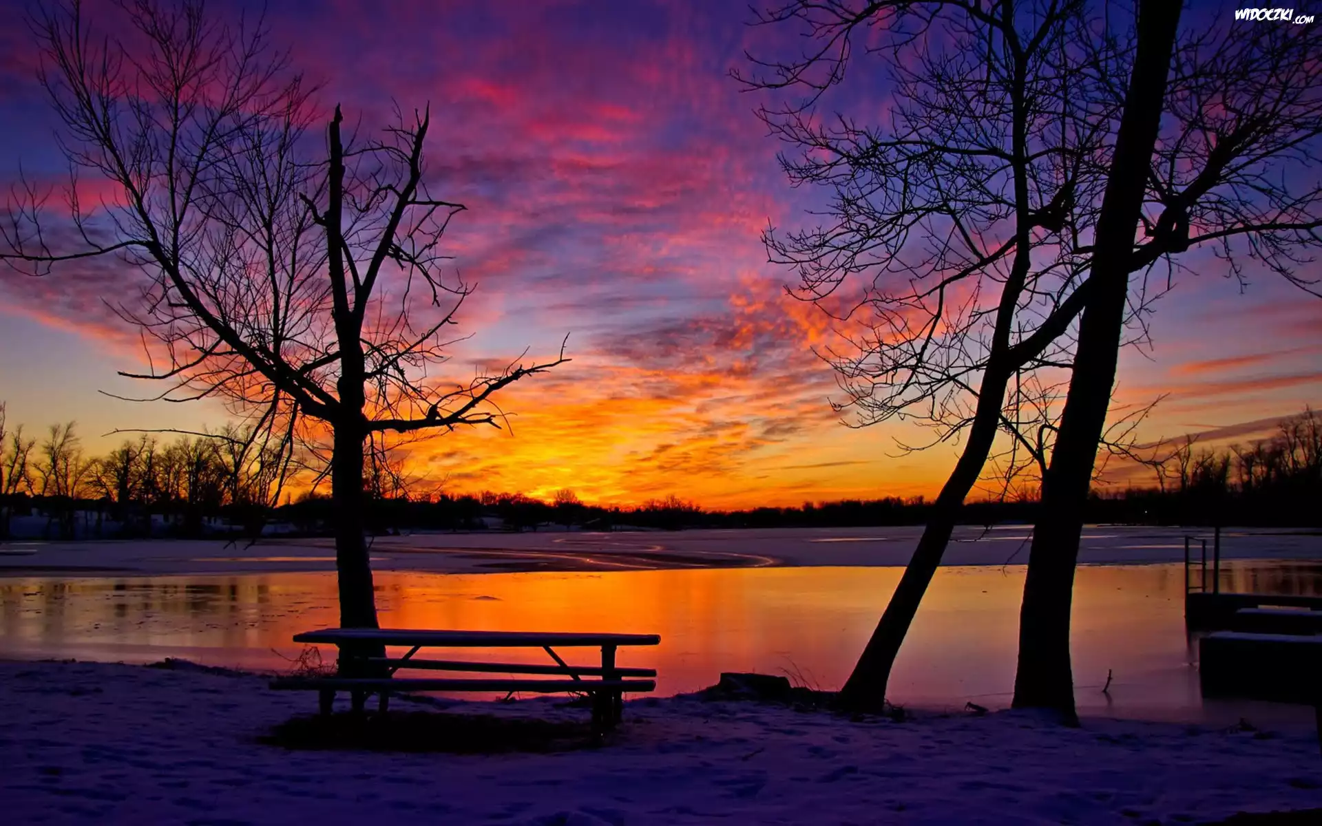 Zdjęcia, Rzeka, Drzewa, Ławka, Zachód, Słońca, Zima