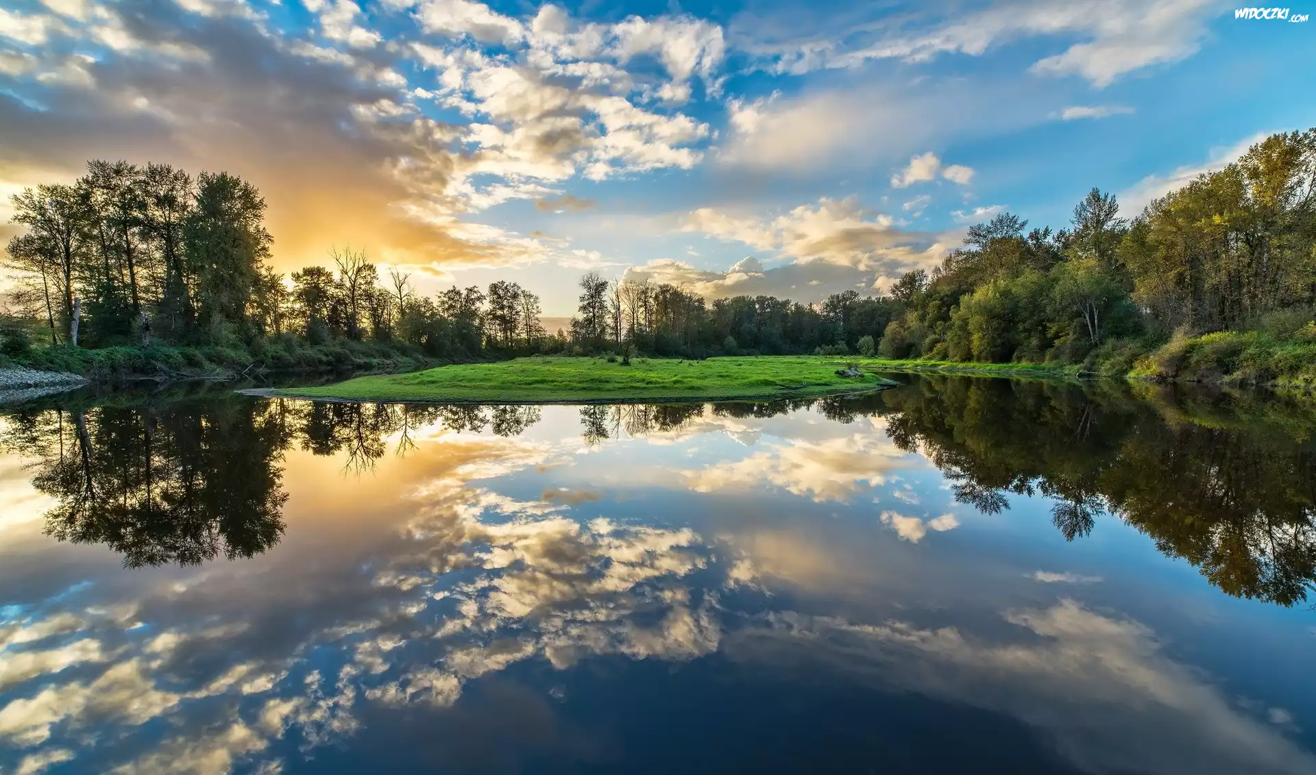Rzeka, Drzewa, Chmury, Wschód słońca, Odbicie