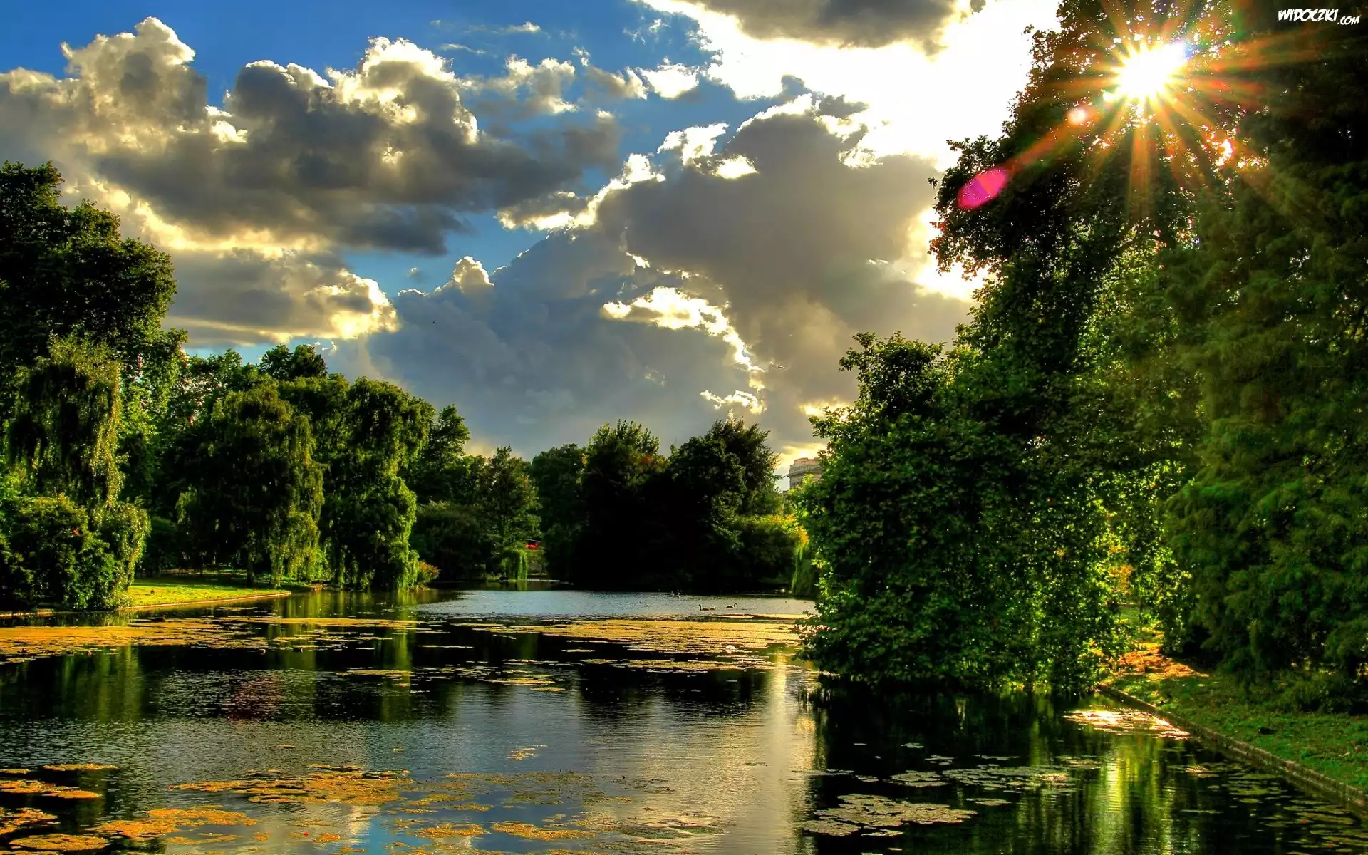 Zdjęcia, Rzeka, Park, Drzewa, Promienie, Słońca, Chmury