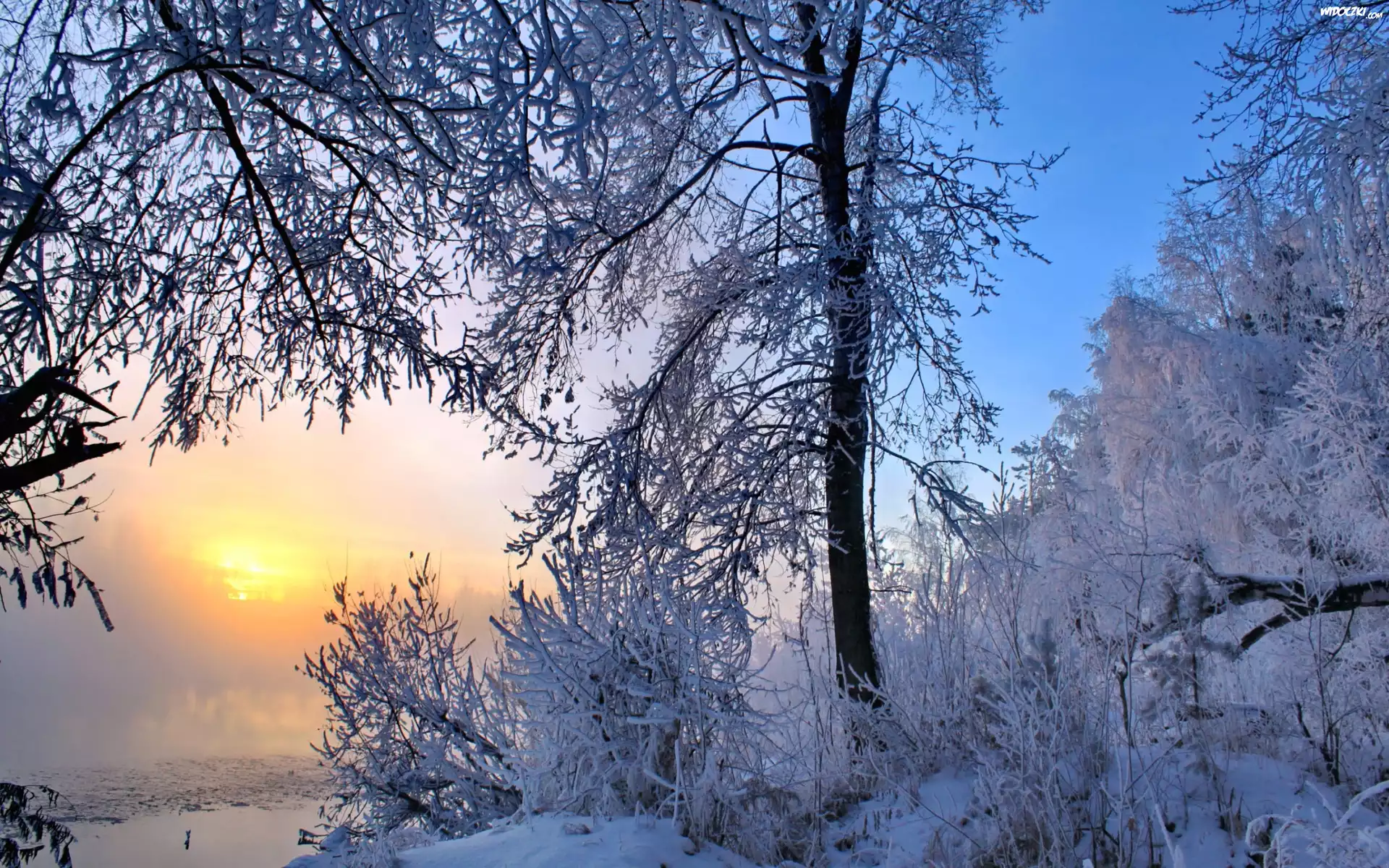 Rzeka, Mgła, Drzewa, Wschód, Słońca, Zima