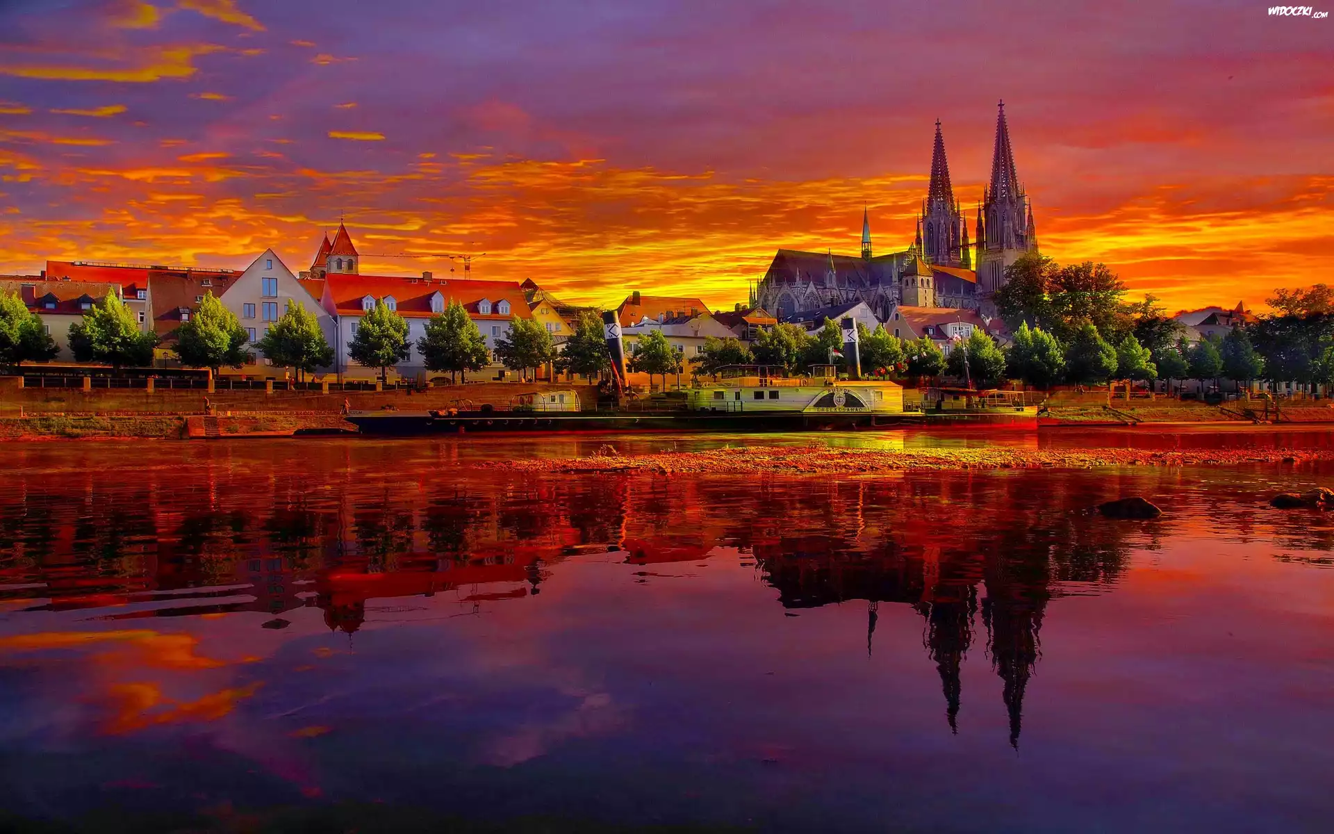 Rzeka, Domy, Kościół, Zachód, Słońca, Niemcy