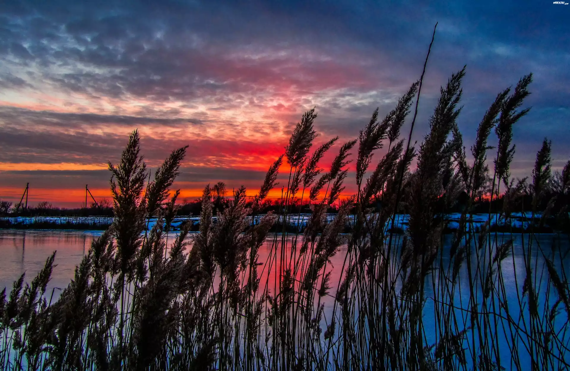 Rzeka, Trawy, Piękny, Zachód, Słońca, Zima