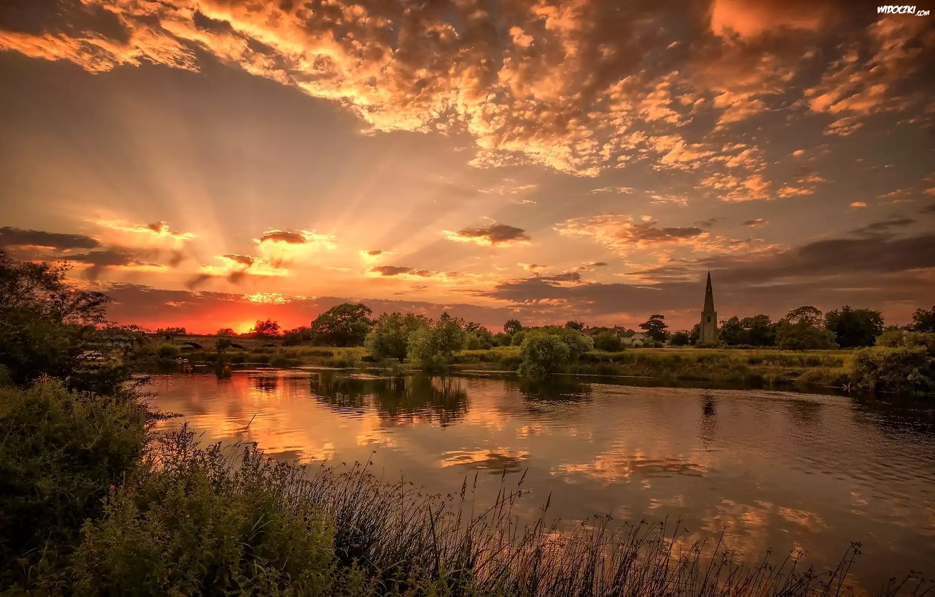 Rzeka, Drzewa, Trawy, Wschód, Słońca, Chmury