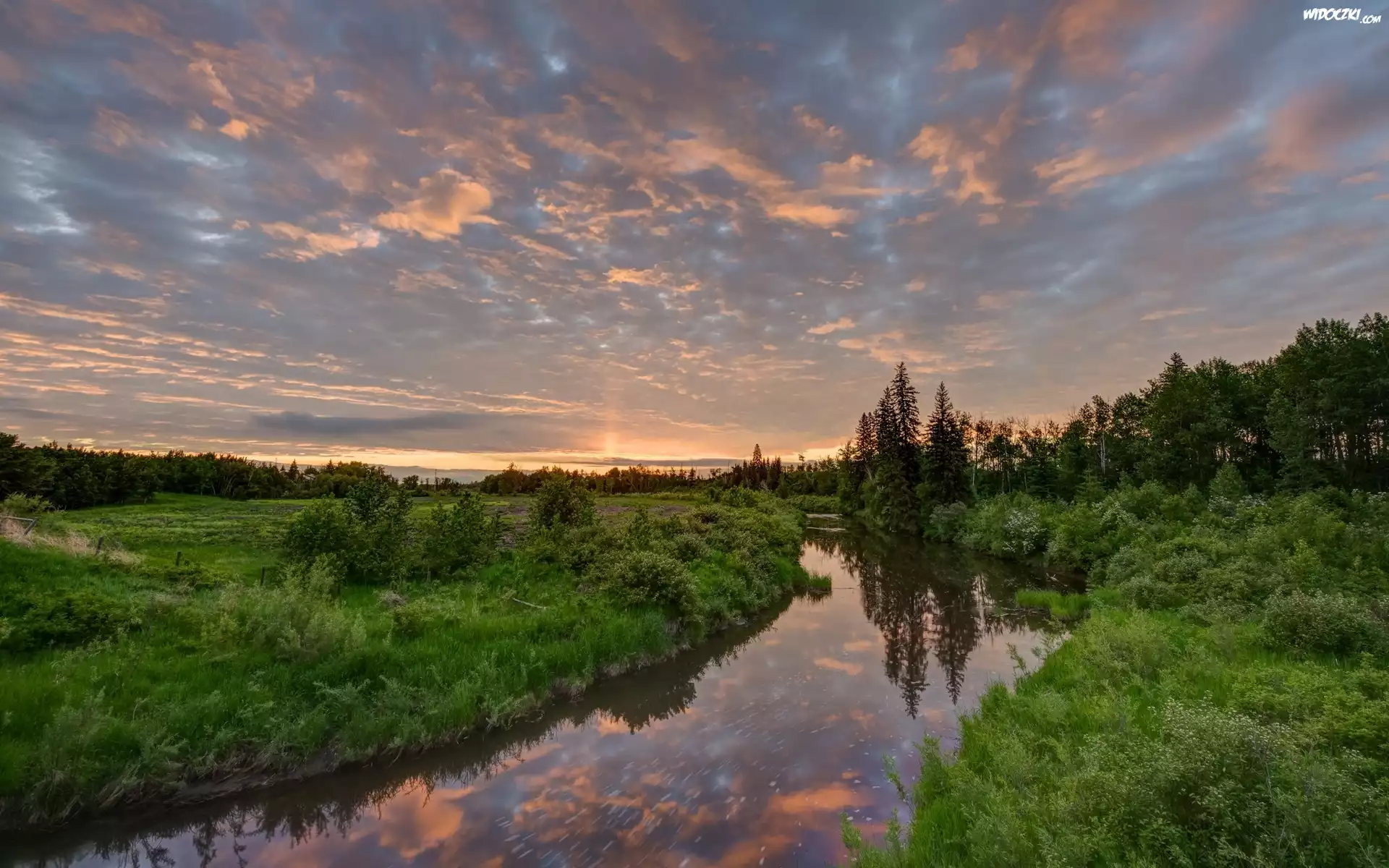 Rzeka, Chmury, Zachód słońca, Drzewa