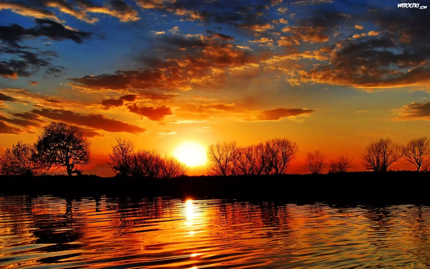 Zdjęcia, Rzeka, Chmury, Zachód, Słońca, Krzewy