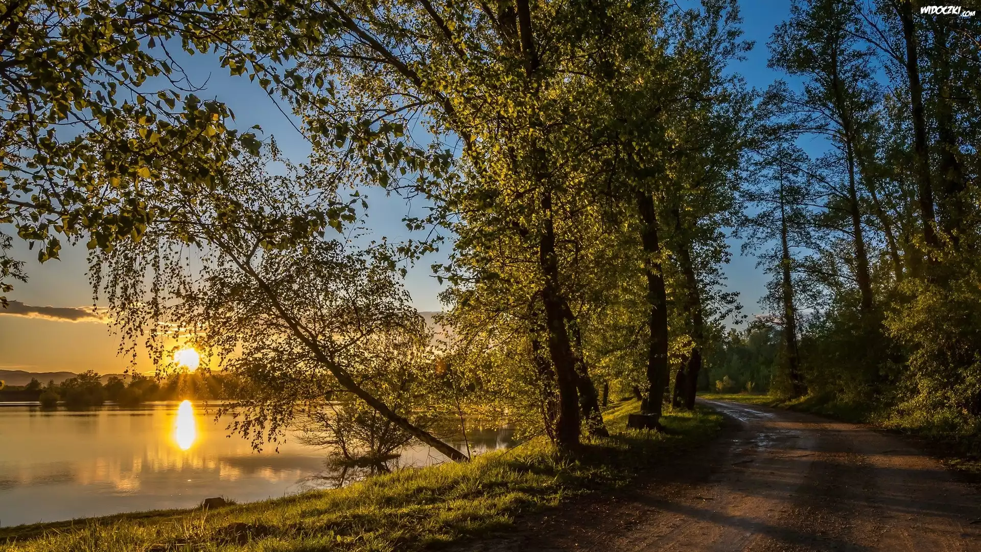 Zdjęcia, Rzeka, Drzewa, Zachód słońca, Droga