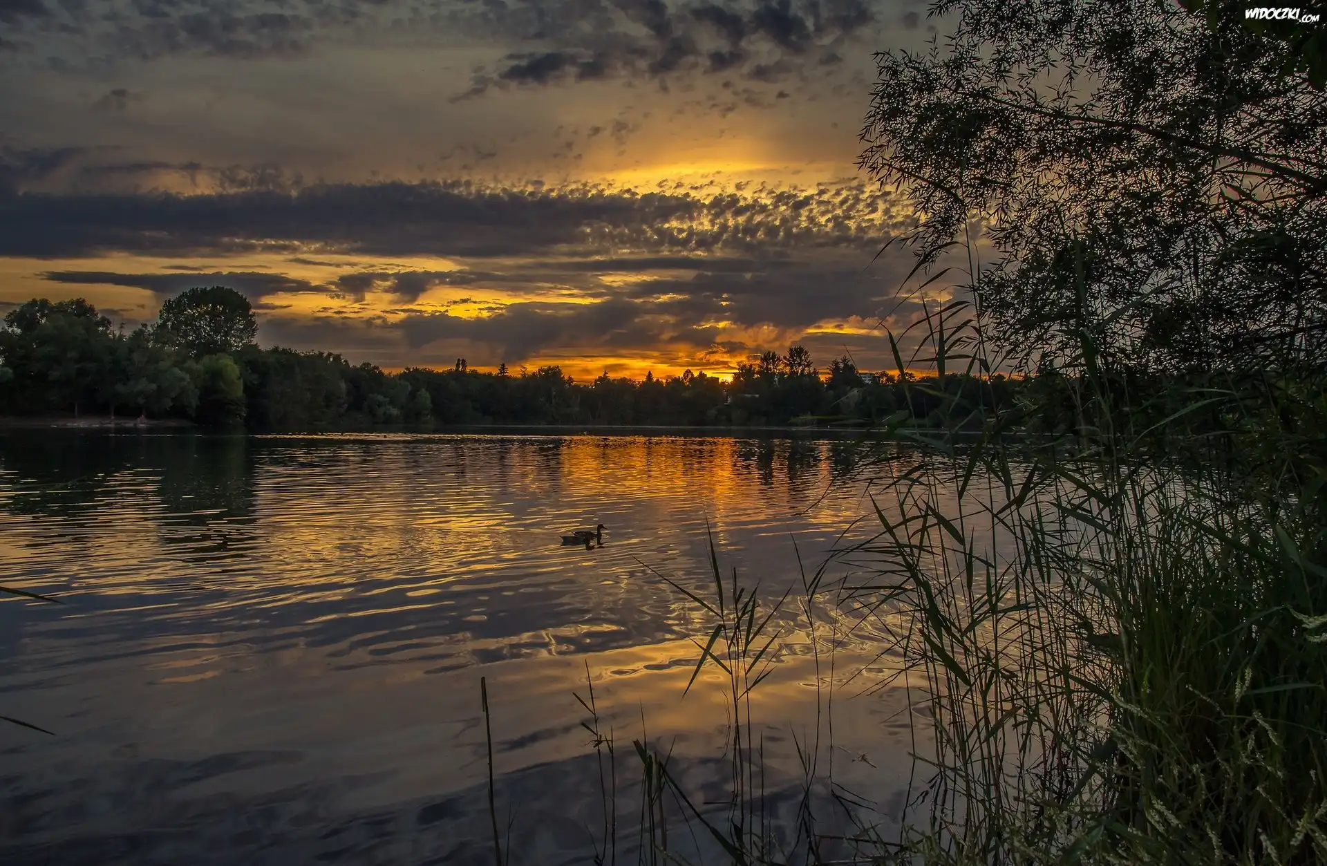 Zdjęcia, Rzeka, Drzewa, Zachód, Słońca, Kaczki