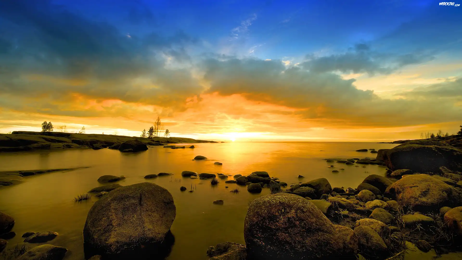 Zdjęcia, Rzeka, Kamienie, Zachód słońca, Drzewa