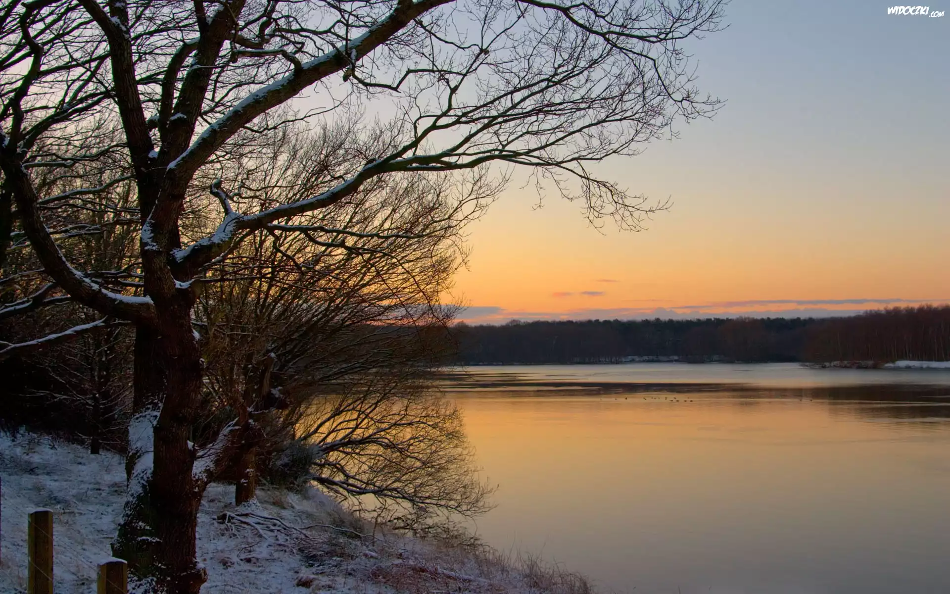 Zdjęcia, Rzeka, Lasy, Zachód, Słońca, Zima