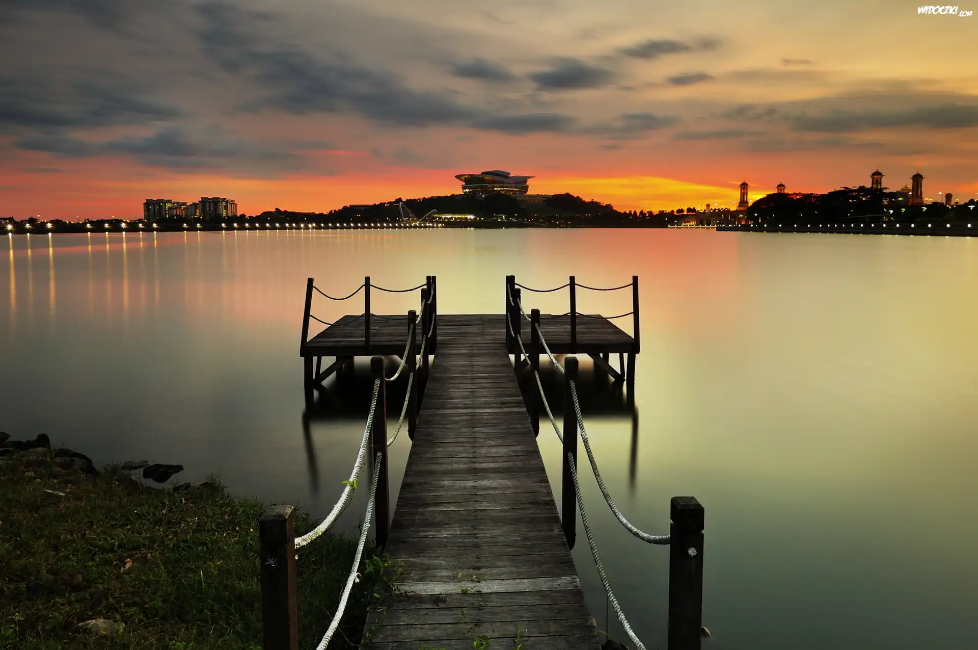 Zdjęcia, Rzeka, Pomost, Zachód, Słońca, Miasto
